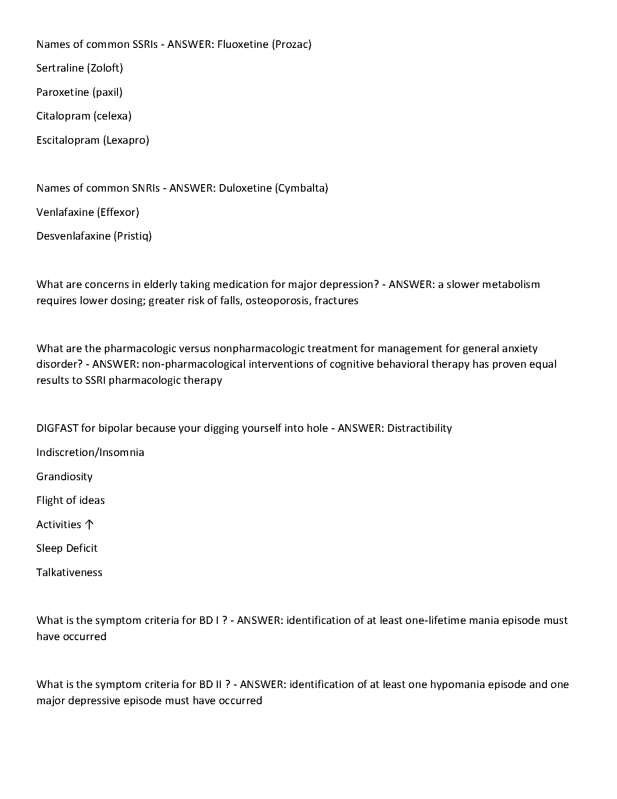 Ace your psychiatric nursing exam with this comprehensive study guide! Specifically tailored for Maryville University's NURS 623 Exam 3, this resource provides detailed questions and verified answers on essential topics like anxiety, major depressive disorder, DSM-5 criteria, differential diagnosis, risk factors, and treatment modalities. Updated for the 2025/2026 academic year, this guide is your key to understanding complex concepts and passing your exam on the first try. Master the material efficiently and walk into your exam with confidence.