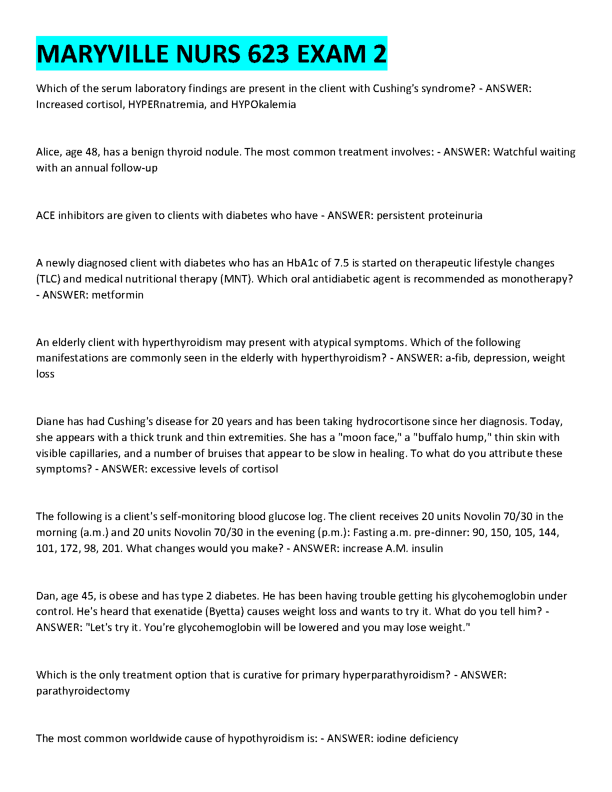 Unlock success in your Maryville University course with the NURS 623 Exam 2 Test Bank. This essential study guide provides a comprehensive collection of exam-style questions paired with expertly verified answers. Dive deep into crucial topics including Cushing's syndrome, diabetes management, thyroid nodules, hyperparathyroidism, and pharmacotherapeutic interventions. This resource is perfectly designed to streamline your study process, enhance your understanding, and give you the confidence to ace your exam on the first attempt. Download now and take the first step towards mastering NURS 623.
