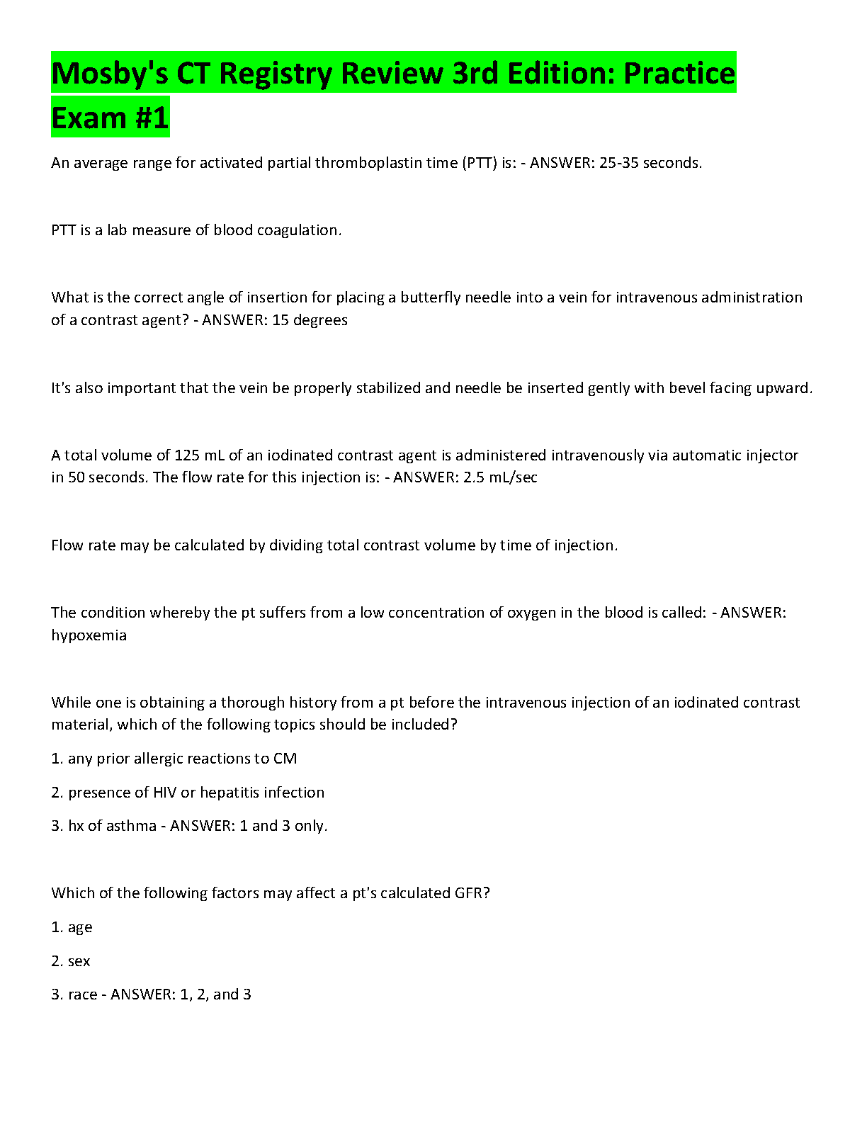 Mosby's CT Registry Review, 3rd Edition by Daniel N. DeMaio - Practice Exam 1 Test Bank with Verified Q&A