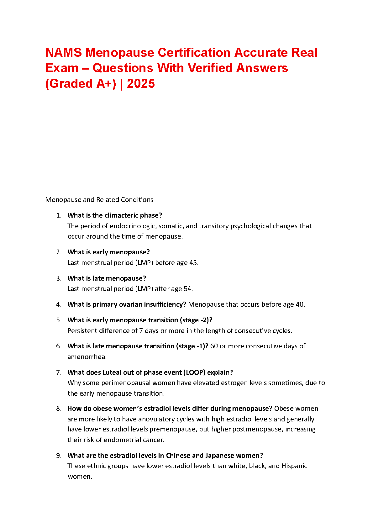 Ace your NAMS Menopause Certification Exam on the first try with our comprehensive 2025/2026 Test Bank! This Graded A+ study guide, developed for The North American Menopause Society (NAMS) exam, features a complete collection of real exam questions paired with 100% accurate, verified answers. Master key topics including the climacteric phase, menopause transitions, primary ovarian insufficiency, and hormonal variations. This resource is expertly designed to boost your confidence and help you pass on your first attempt, avoiding costly resits. Instantly download the ultimate tool to become a NAMS Certified Menopause Practitioner (NCMP).