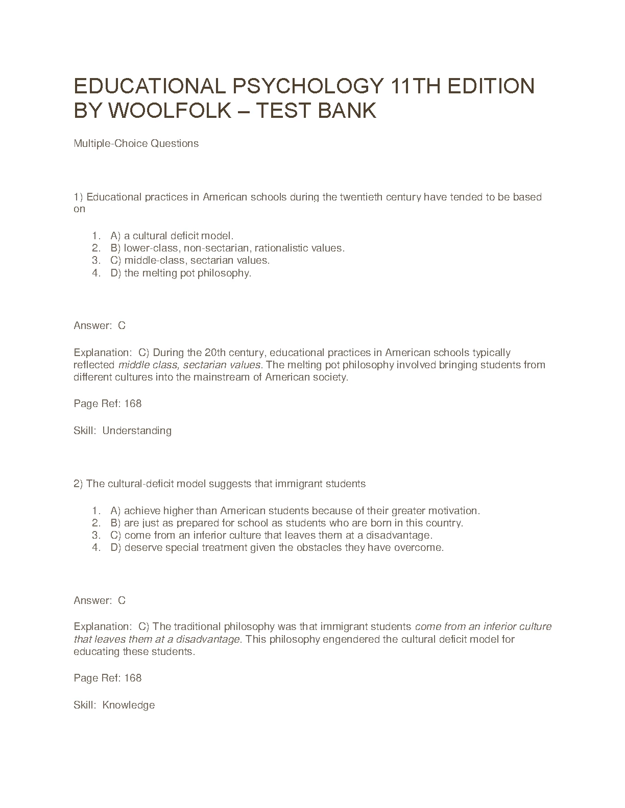 TEST BANK FOR EDUCATIONAL PSYCHOLOGY 11TH EDITION BY WOOLFOLK
