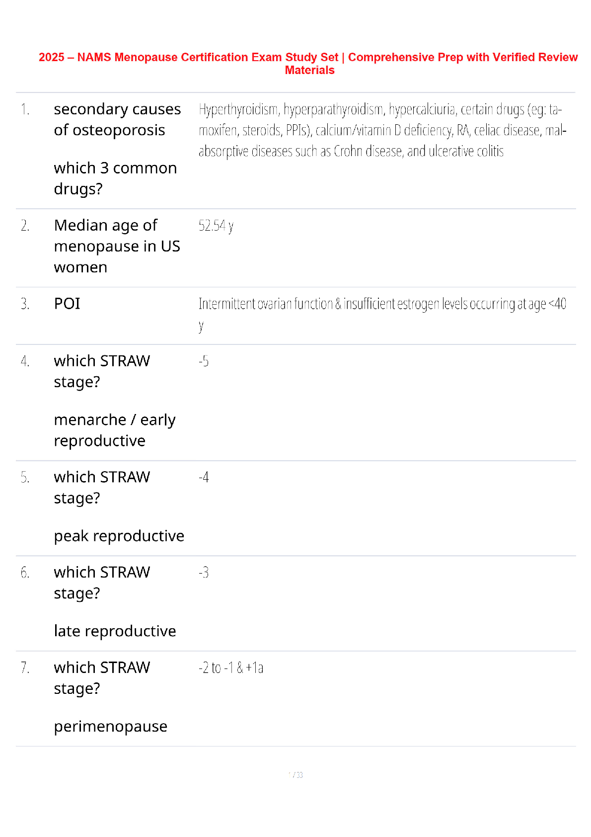 Ace your NAMS Menopause Certification Exam with our ultimate 2025 study resource! This meticulously compiled test bank features a comprehensive collection of exam-style questions and expertly verified answers. It covers all critical domains of menopause management, including secondary causes of osteoporosis, STRAW staging, premature ovarian insufficiency (POI), and other essential topics. Designed for healthcare professionals seeking certification, this guide provides the targeted preparation needed to pass on your first attempt and become a NAMS Certified Menopause Practitioner (NCMP).
