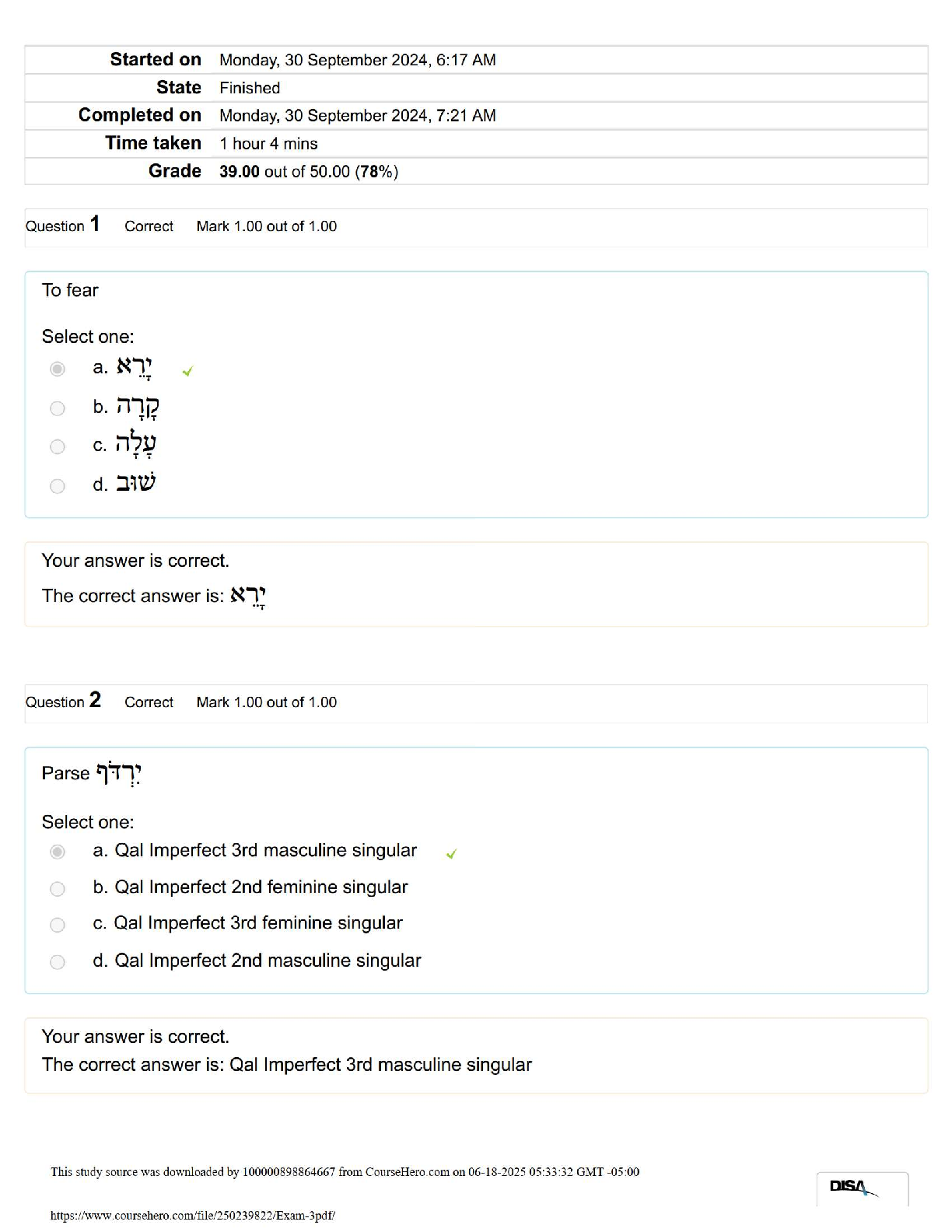 Unlock success in your Biblical Hebrew studies with this complete test bank for Exam 3, designed for the 4th Edition of 'Basics of Biblical Hebrew Grammar' by Pratico and Van Pelt. This resource features a comprehensive collection of exam-style questions and verified correct answers, focusing on critical areas such as vocabulary and verb parsing (e.g., Qal Imperfect). Ideal for exam preparation, this test bank allows you to practice with authentic materials, master complex grammatical concepts, and confidently achieve a high grade.