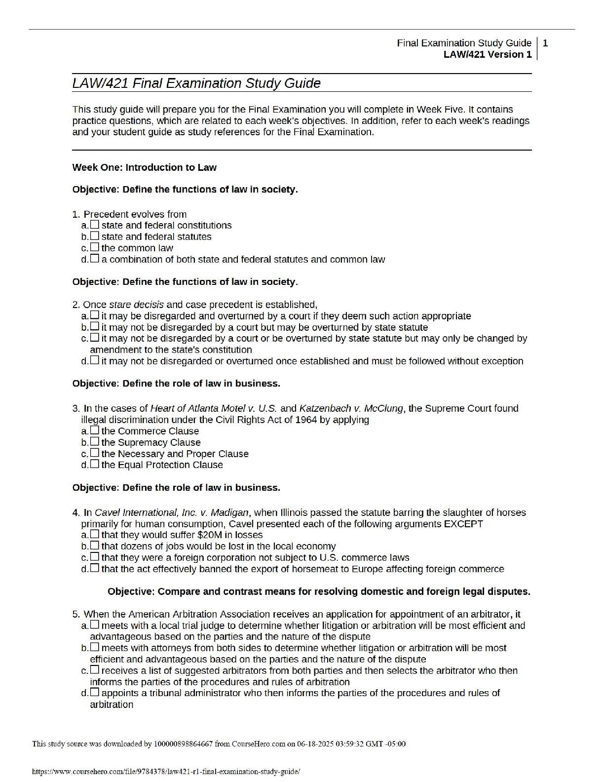 Ace your LAW 421 Final Exam on the first try with our latest 2025/2026 Test Bank. This comprehensive study guide, based on 'The Legal Environment of Business, 10th Edition' by Henry R. Cheeseman, provides an extensive collection of practice questions and verified answers. Covering key topics like the functions of law, stare decisis, and dispute resolution, this resource is perfectly designed to boost your understanding and exam performance. Stop worrying about resits—gain the confidence you need to secure a top grade in your business law course. Download now and start preparing smarter for your final exam.
