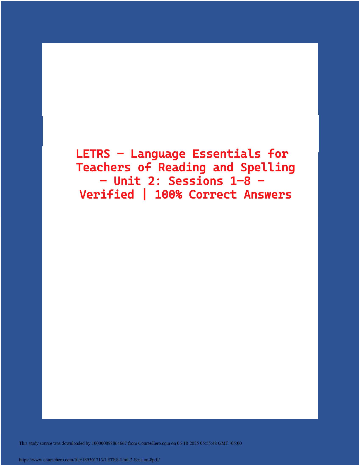 LETRS (3rd Edition) by Moats & Tolman Test Bank - Unit 2 Sessions 1-8 | Language Essentials for Teachers of Reading and Spelling | 100% Correct, Verified Answers