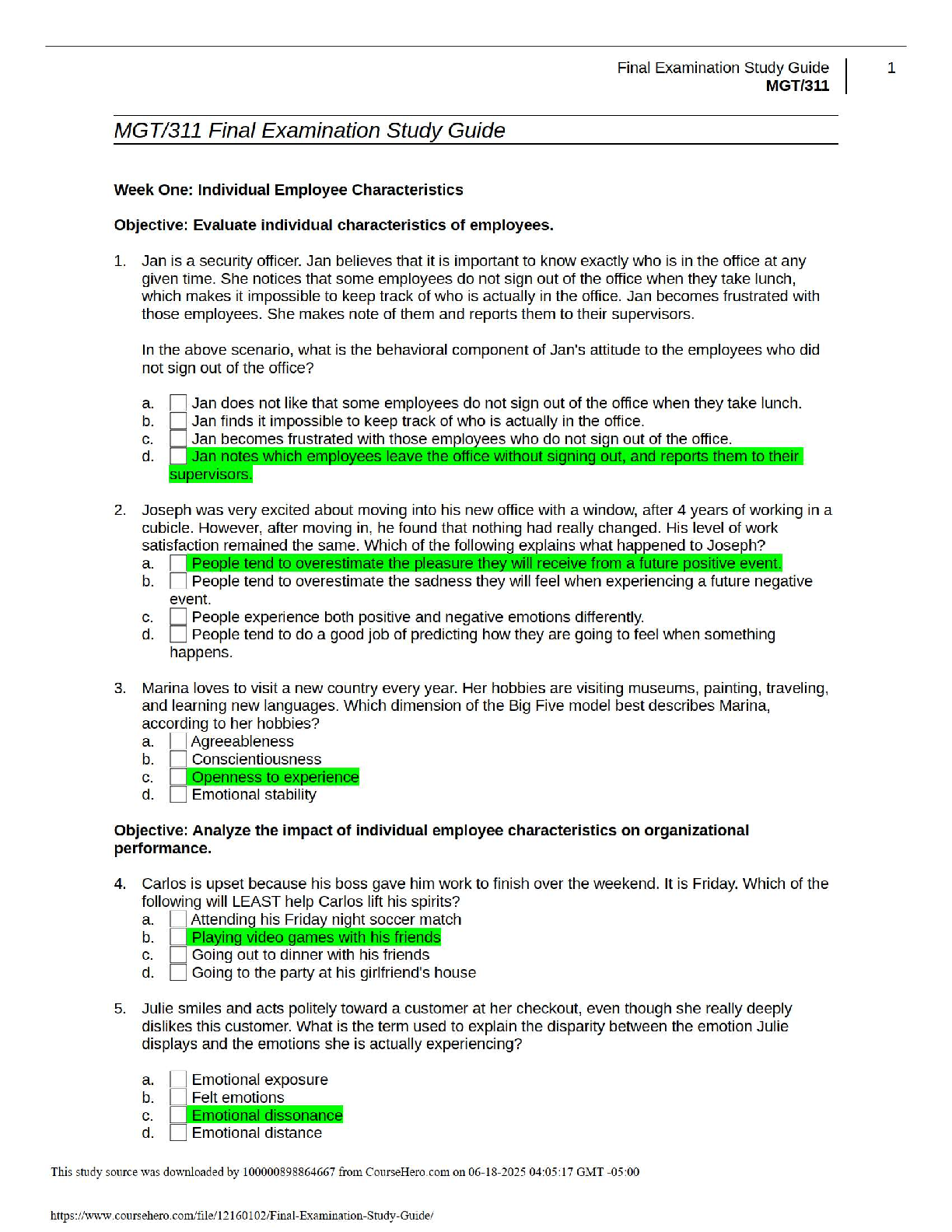 Ace your MGT/311 Organizational Behavior final exam with this comprehensive Test Bank for the 19th Edition by Robbins and Judge. This indispensable study guide provides a complete collection of practice questions and verified answers, covering all essential topics from the course, including individual employee characteristics, attitudes, personality, and emotional dynamics. Designed to mirror the actual final exam format, this resource is your key to mastering complex concepts, avoiding resits, and securing top grades. Download now and confidently prepare to pass on your first attempt!