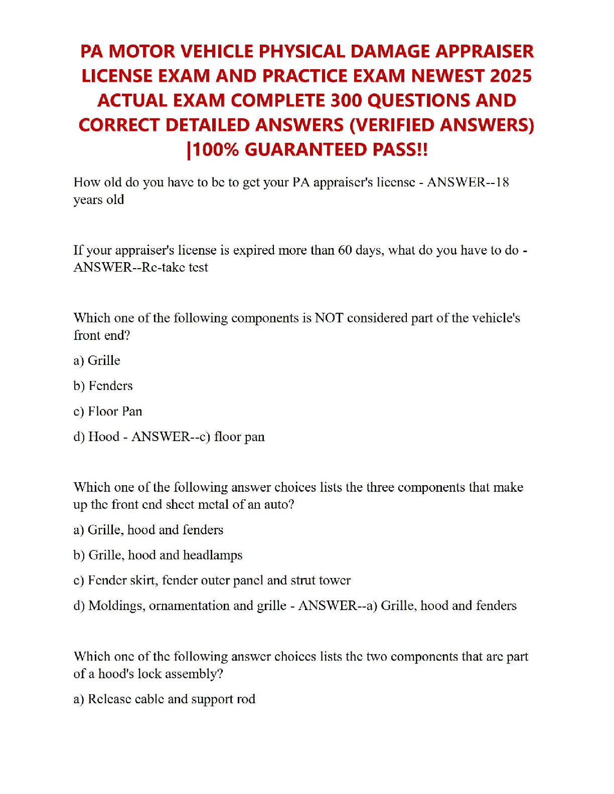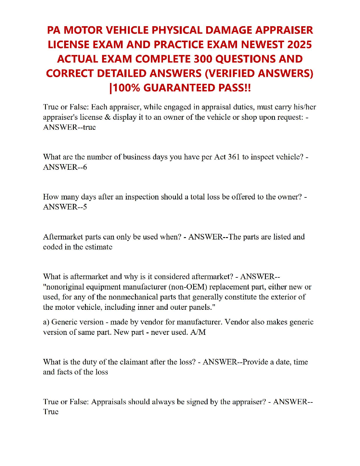 Ace your Pennsylvania Motor Vehicle Physical Damage Appraiser licensing exam with confidence! This comprehensive 2025 test bank provides an extensive collection of over 300 actual exam questions, each paired with a verified, detailed answer. Our study guide is meticulously designed to cover all essential topics you'll encounter on the real test, from appraisal duties and regulations like Act 361 to understanding aftermarket parts and claimant responsibilities. Stop worrying about resits and secure your license on the first try. This resource is your key to a guaranteed pass and a successful career as a certified appraiser in Pennsylvania.