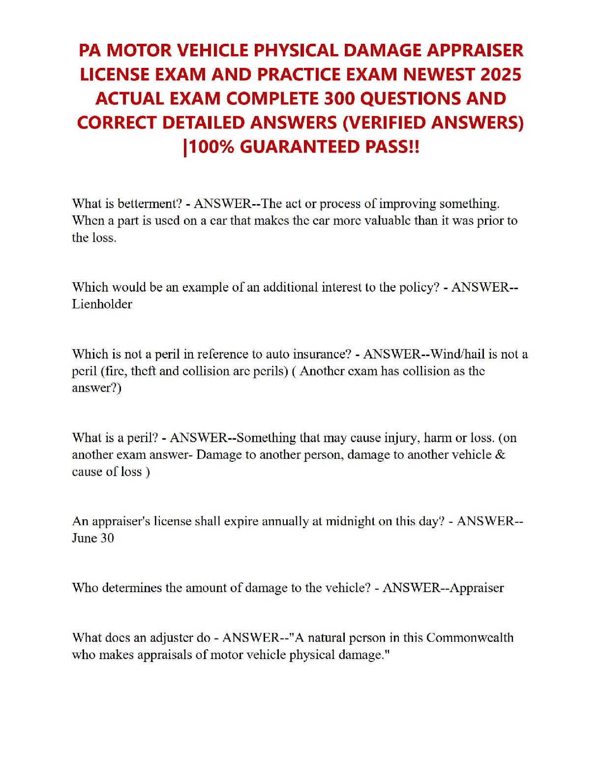 PA Motor Vehicle Physical Damage Appraiser License Exam Test Bank 2025: Master the Test with 300+ Verified Questions and Comprehensive Answers