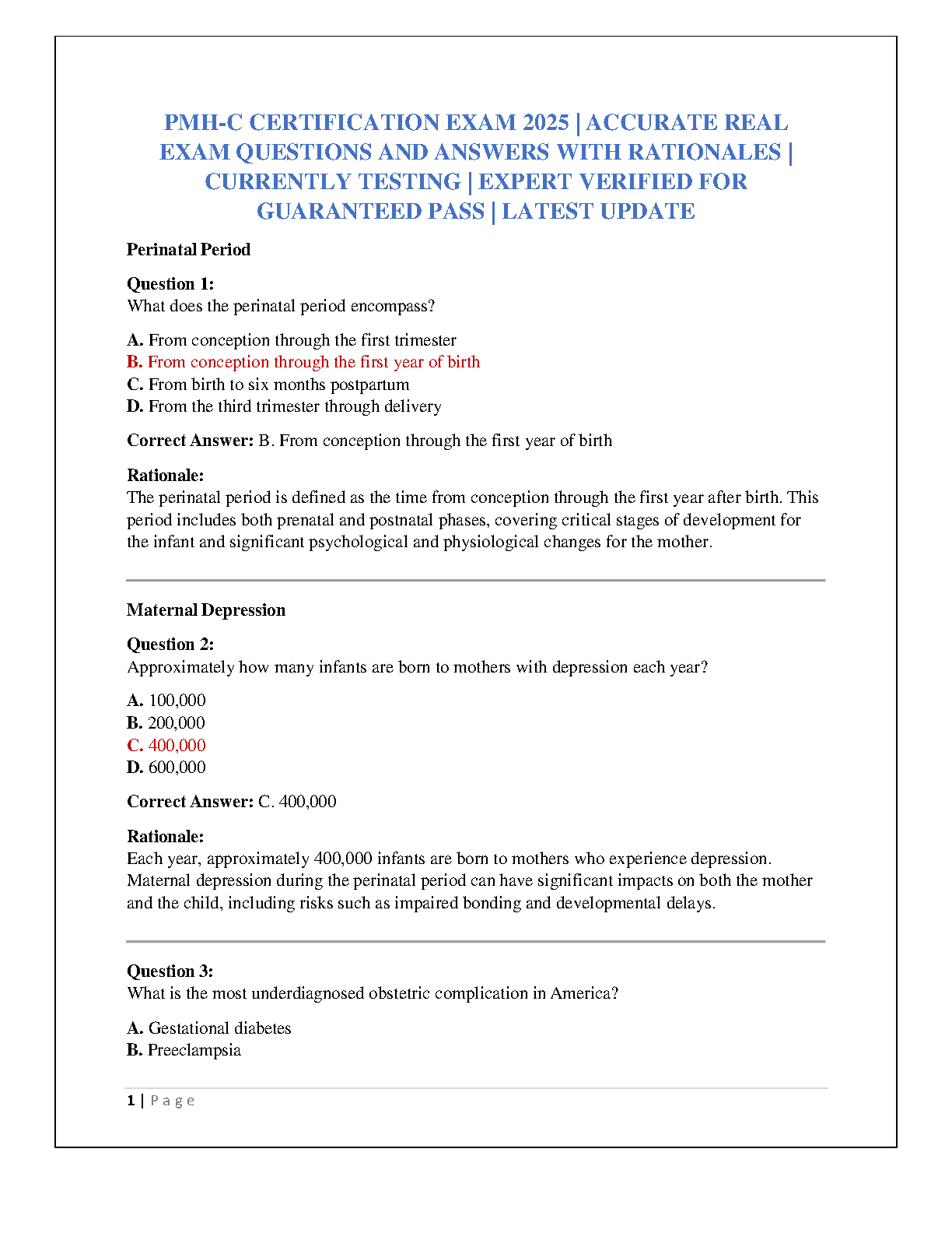 Excel on your Perinatal Mental Health Certification (PMH-C) exam with our premier 2025 test bank. This comprehensive study guide features an extensive collection of expert-verified questions, precise answers, and in-depth rationales that mirror the actual exam content. Designed to help you pass confidently on your first attempt, this resource covers all critical domains of perinatal mental health. Master the material, avoid resits, and achieve your certification with this essential and up-to-date preparation tool.