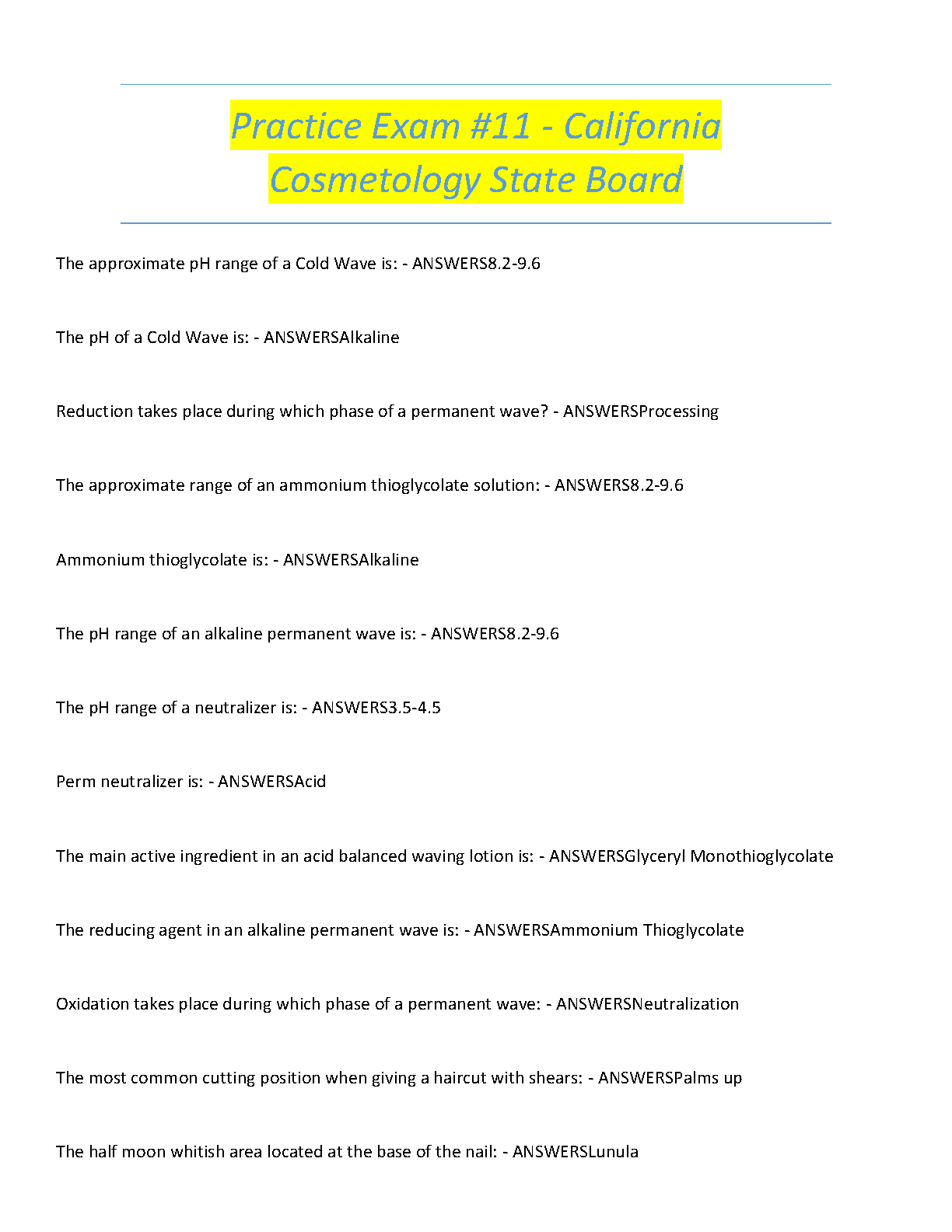 Ace your California Cosmetology State Board exam on the first attempt with our comprehensive Test Bank for Practice Exam #11, updated for the 2025/2026 academic year. This essential study guide provides a complete set of verified questions and instant answers, covering critical topics such as chemical services, pH levels, permanent waving phases, product ingredients, and practical haircutting and nail anatomy. Stop memorizing and start understanding with this targeted Q&A resource, designed to build your confidence and ensure you pass without needing a resit. Get the answers you need to succeed and launch your cosmetology career!