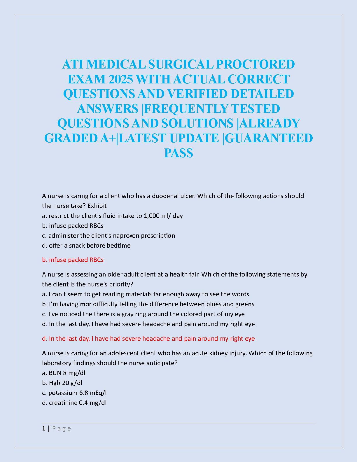 Ace your ATI Medical-Surgical Proctored Exam on the first try with our ultimate 2025 test bank! This comprehensive study guide is meticulously compiled with the latest, frequently tested questions and verified, detailed answers. Designed for nursing students aiming for an A+ grade, this resource covers all essential Med-Surg topics, ensuring you're fully prepared for the actual exam. Stop worrying about resits and gain the confidence to succeed with our guaranteed-pass materials.