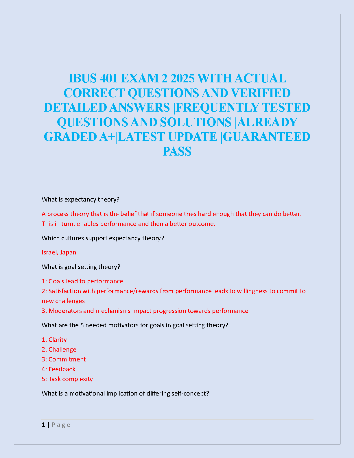 Ace your IBUS 401 Exam 2 with our comprehensive and up-to-date test bank for the 2025/2026 academic year. This essential study resource features a collection of actual exam questions, complete with verified and detailed answers. Dive deep into key topics like expectancy theory, goal-setting theory, and motivational concepts, which are frequently tested. Our guide is meticulously prepared to ensure you understand the material thoroughly, helping you earn an A+ and pass your exam on the first attempt with confidence. Stop worrying about resits and start studying smarter with this guaranteed-to-help resource.