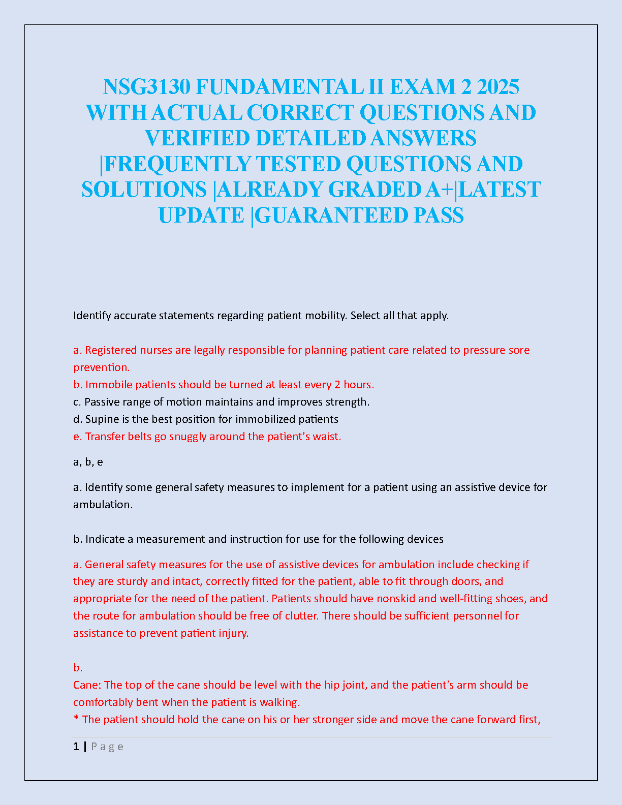 Unlock academic success in your NSG3130 Fundamental II course with the official Test Bank for the 11th Edition of 'Fundamentals of Nursing' by Taylor, Lynn, and Bartlett. This comprehensive resource is packed with verified questions and detailed, rationalized answers covering all essential topics, including patient mobility, safety measures, and use of assistive devices. Designed to mirror the actual Exam 2 format, this A+ graded study guide features frequently tested questions and the latest updates for the 2025 academic year. Master the material, boost your confidence, and achieve a guaranteed pass on your first attempt. Stop stressing and start studying smarter!