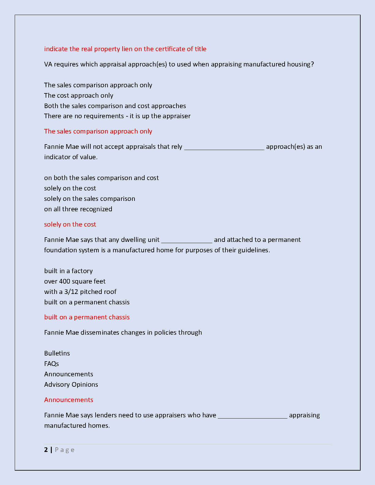 Ace your Appraisal Subject Matter Electives Exam on the very first try! This is the latest, fully updated test bank for the 2025-2026 academic year, meticulously crafted to ensure your success. Inside, you'll find a comprehensive collection of actual exam questions, each paired with a verified, detailed answer and solution. Our resource covers frequently tested topics, including the nuances of FHA appraisals for manufactured homes and various appraisal systems. This A+ graded guide is your key to mastering the material, boosting your confidence, and passing with flying colors. Don't risk a resit – prepare with the best and guarantee your pass!