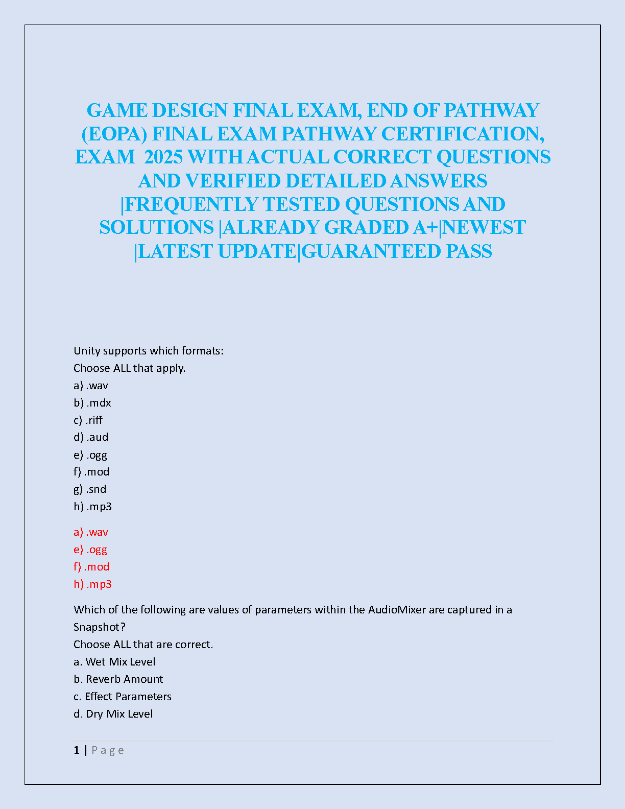 Struggling with your Game Design End of Pathway (EOPA) final exam? This comprehensive test bank is your ultimate study tool for the 2025 certification exam. It features a collection of the latest, frequently tested questions, complete with verified, detailed answers and solutions. Each question is designed to mirror the actual exam format, covering key topics like Unity development and more. This resource has already helped students achieve A+ grades. Download now to master the material, boost your confidence, and pass your exam on the very first try, securing your pathway certification without the stress of resits.