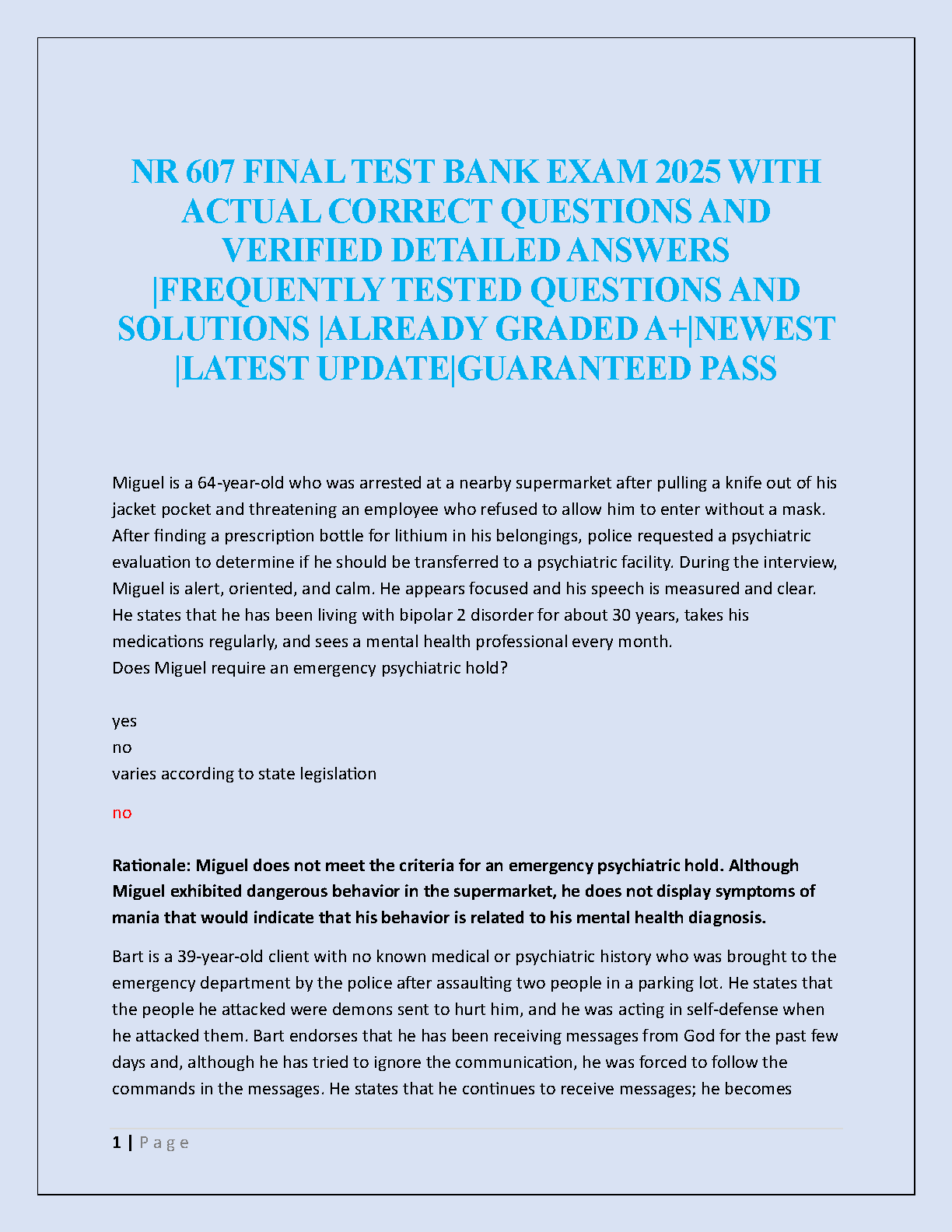 Ace your NR 607 Final Exam with our 2025 updated Test Bank! This essential study guide provides a complete collection of frequently tested questions, each paired with a verified correct answer and a detailed rationale. Designed to help you master complex topics and prepare effectively, our resource ensures you walk into your exam with confidence. Achieve an A+ grade and guarantee your pass on the first attempt with this comprehensive and reliable study tool.
