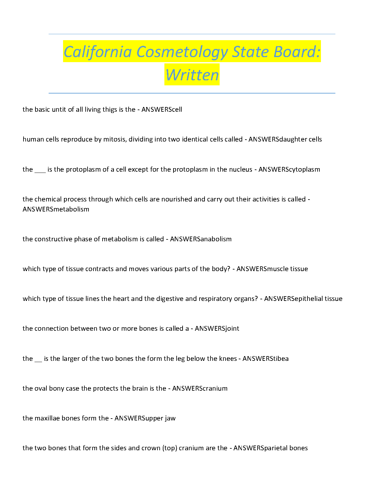 Unlock your success with our definitive study guide for the California Cosmetology State Board Written Exam, fully updated for the 2025/2026 academic year. This comprehensive resource provides a detailed collection of exam-style questions and verified answers, covering essential topics such as cell structure, metabolism, tissue types, and human anatomy. Designed to streamline your study process, this guide helps you grasp key concepts quickly and confidently. Prepare effectively, eliminate guesswork, and walk into your exam ready to pass on the very first attempt. Avoid costly resits and start your cosmetology career sooner with this essential exam elaboration.