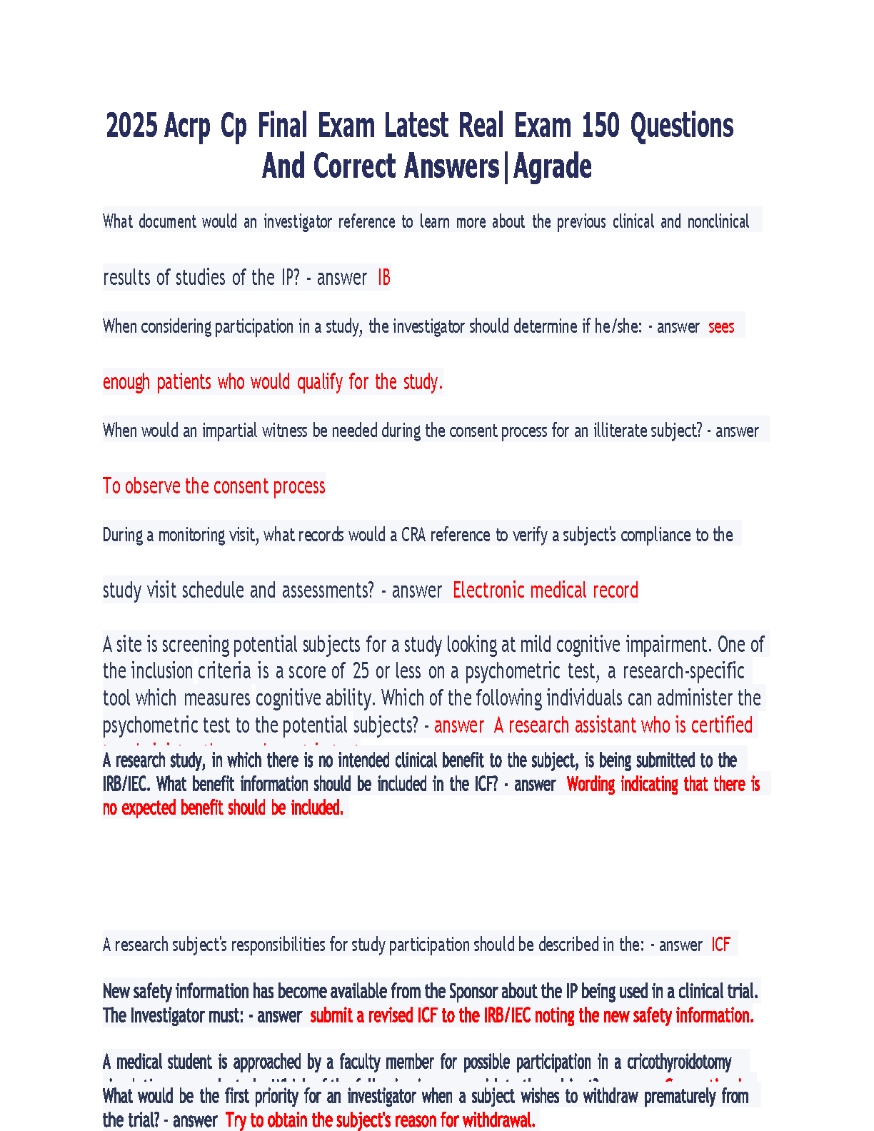 Latest 2025/2026 ACRP-CP Final Exam Study Guide: 150 Real Exam Questions and Expert-Verified Answers