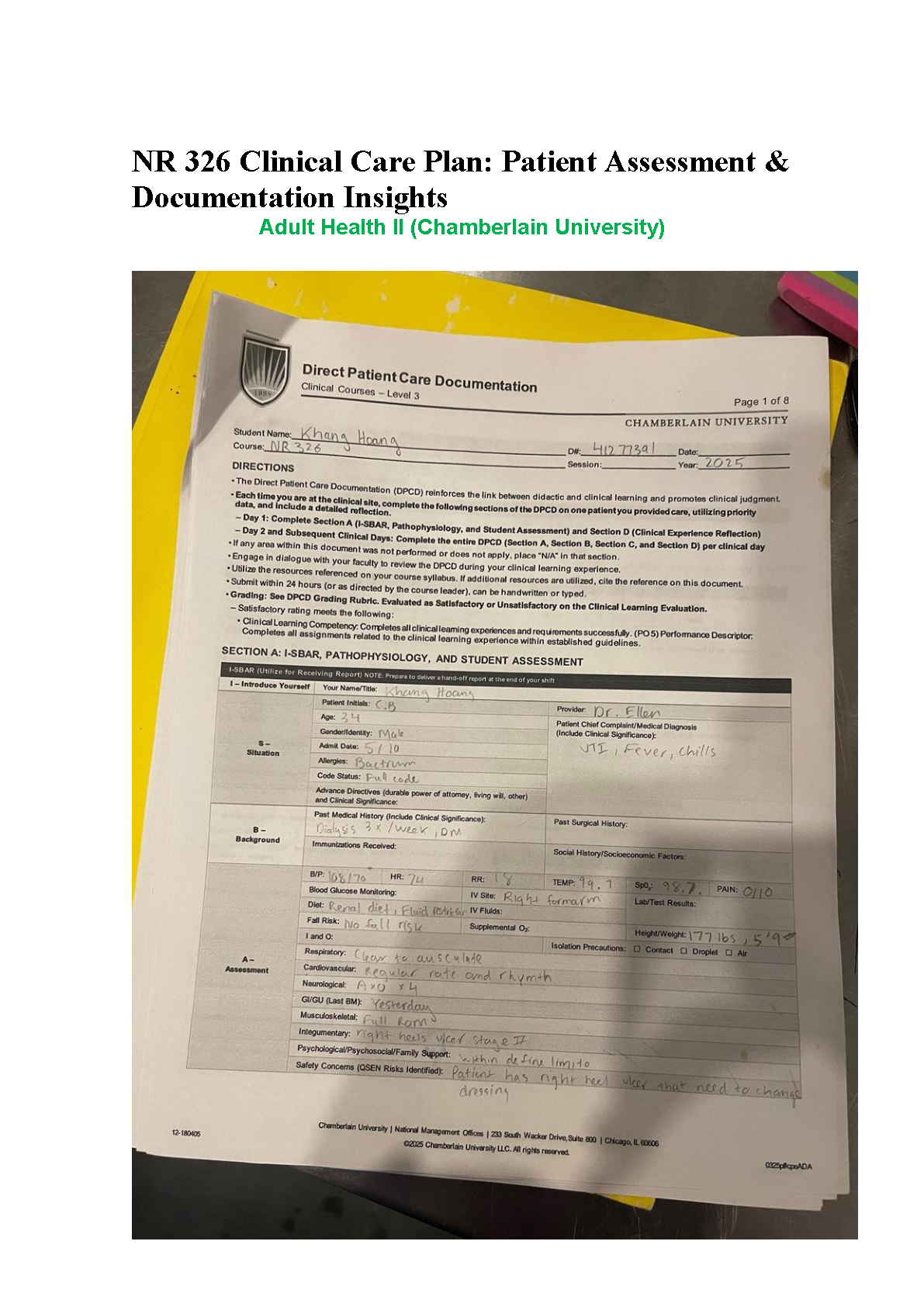 Unlock academic success in your Adult Health II course with this comprehensive, A-grade example of the NR 326 Direct Patient Care Documentation from Chamberlain University. This latest 2025/2026 resource provides a detailed, completed clinical care plan, including the I-SBAR, patient assessment, and documentation insights. Use this expertly crafted case study as a definitive guide to structure your own assignments, deepen your understanding of clinical reasoning, and master the key concepts needed to excel in your exams and clinicals. This essential study aid is designed to help you pass on your first attempt and avoid costly resits, securing your path to becoming a successful nurse.