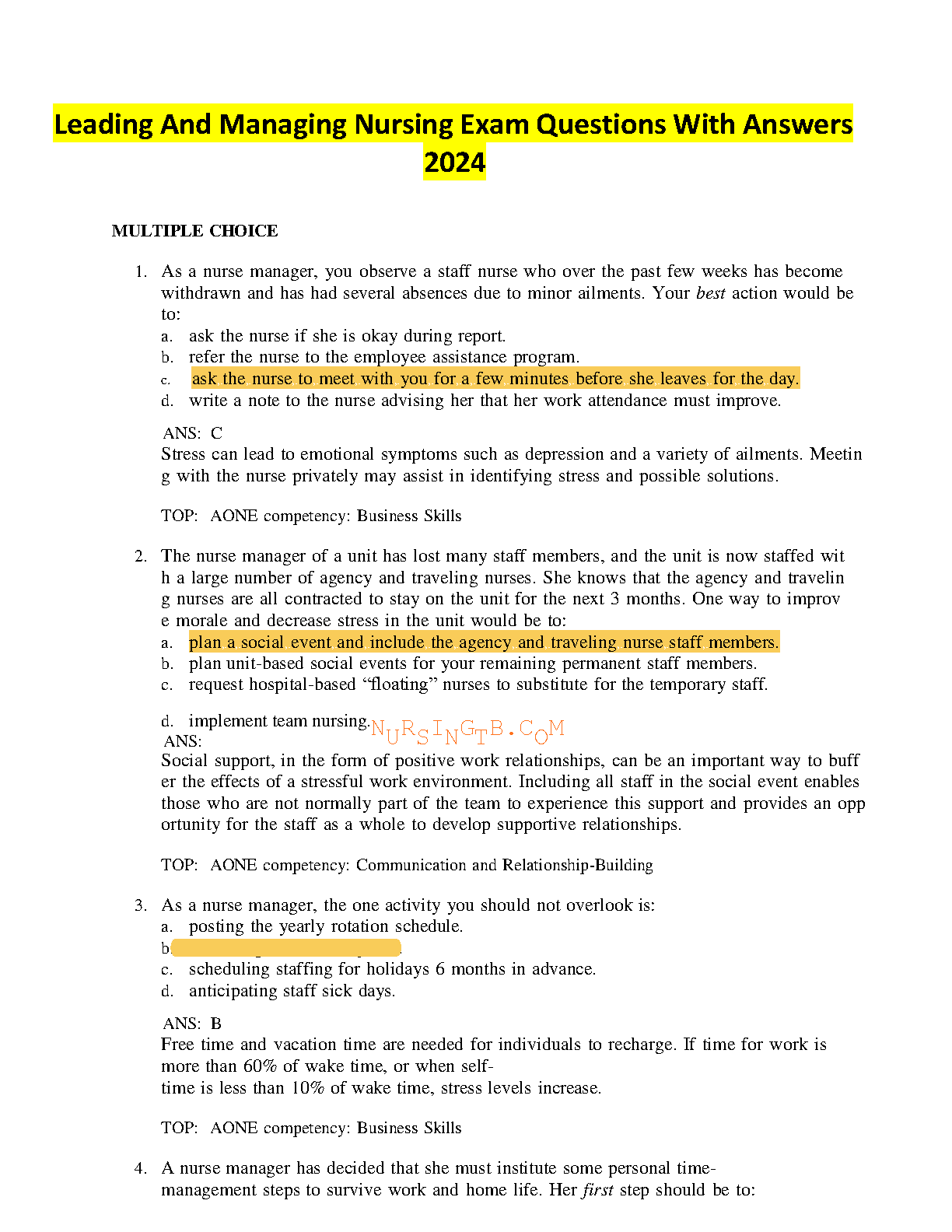 Unlock success in your nursing leadership course with the complete Test Bank for 'Leading and Managing in Nursing, 8th Edition' by Patricia S. Yoder-Wise and Susan A. Sportsman. This essential study tool provides hundreds of exam-style multiple-choice questions, complete with verified answers and in-depth rationales for every question. Directly aligned with the textbook, this test bank helps you master key concepts, practice for your exams, and build the confidence needed to excel. Prepare effectively, understand the 'why' behind each answer, and conquer your nursing management course. Instant download and get ready to ace your exams!