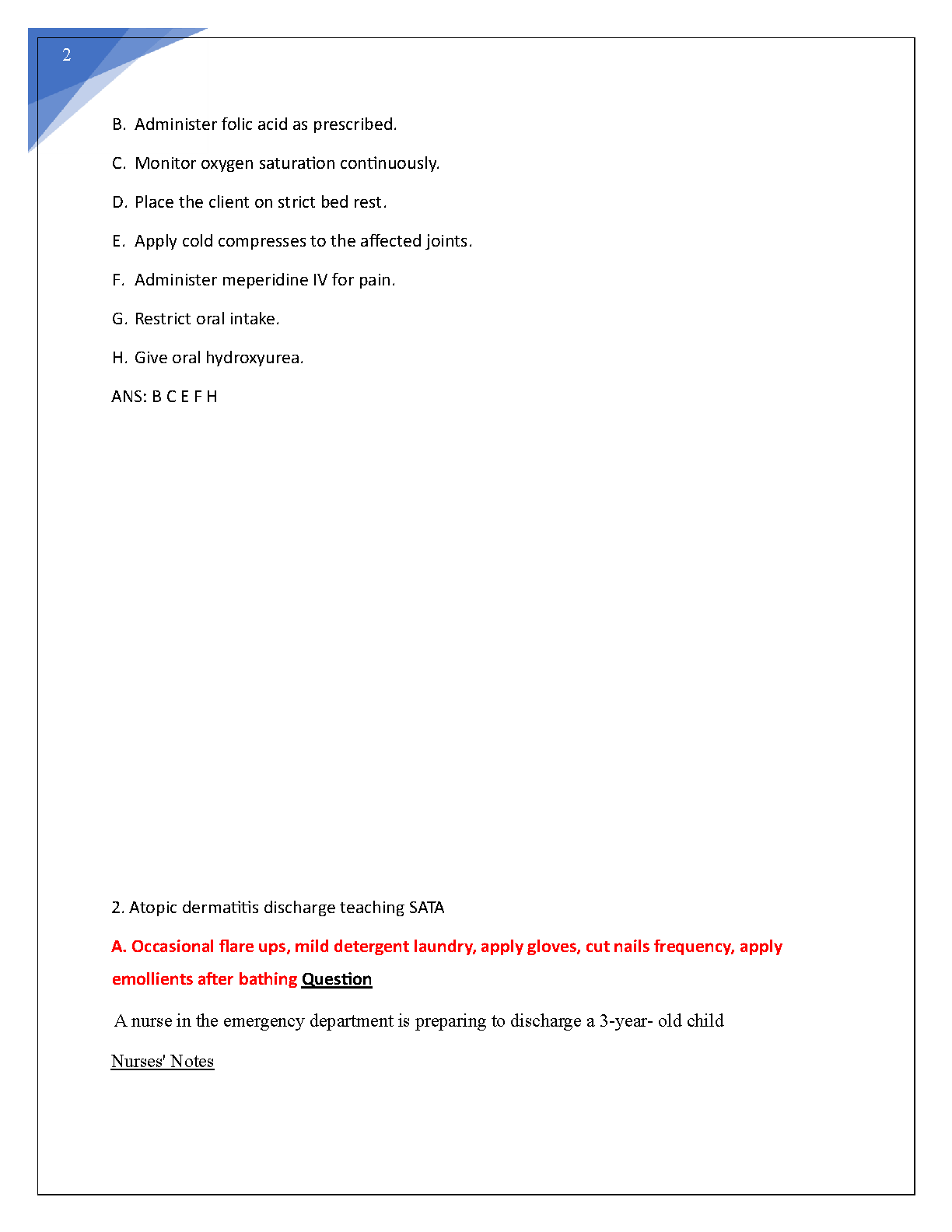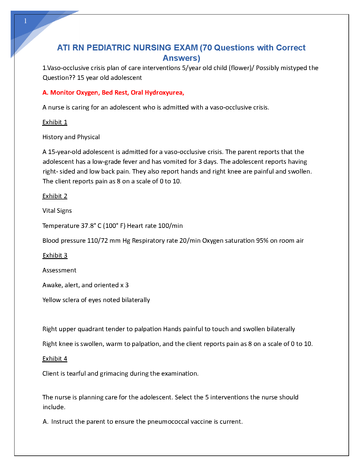 Ace your ATI RN Pediatric Nursing Exam with our latest 2025/2026 Test Bank! This comprehensive study guide features 70 meticulously crafted questions, each paired with a verified, correct answer. Designed specifically for nursing students aiming for top scores, this resource covers all critical topics you'll encounter on the actual exam, including complex scenarios like vaso-occlusive crisis management. Stop struggling and start studying smart. This test bank is your key to mastering pediatric nursing concepts, boosting your confidence, and passing your ATI exam on the very first try. Get instant access to the materials you need for an A+ grade!