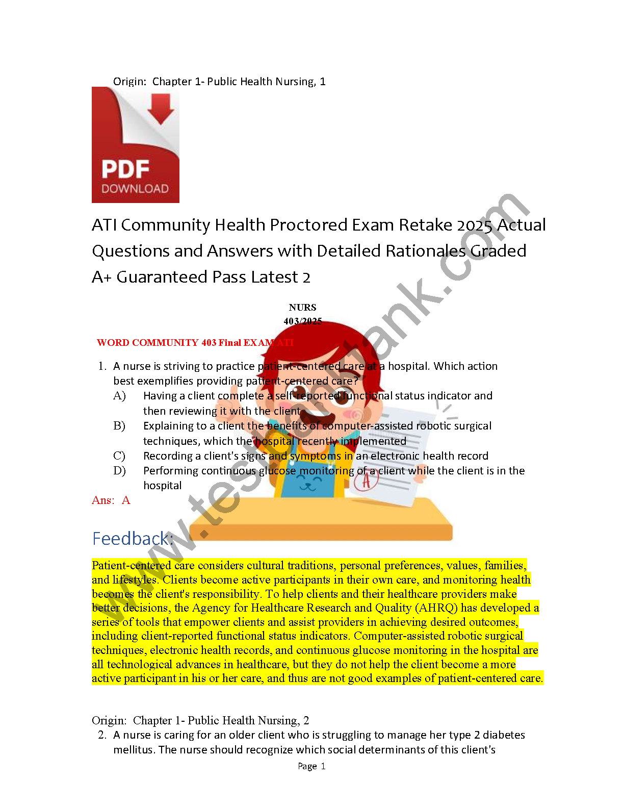 Achieve an A+ on your ATI Community Health Proctored Exam with our latest 2025/2026 test bank for 'Public Health Nursing: Population-Centered Health Care in the Community,' 10th Edition by Stanhope and Lancaster. This comprehensive resource is packed with hundreds of actual exam-style questions, complete with verified answers and in-depth rationales for every question. Master key concepts in public and community health nursing, from patient-centered care to social determinants of health. This study guide is expertly designed to help you understand the material deeply, ensuring you pass your exam on the first try and avoid costly resits. Download now and start studying smart for guaranteed success!