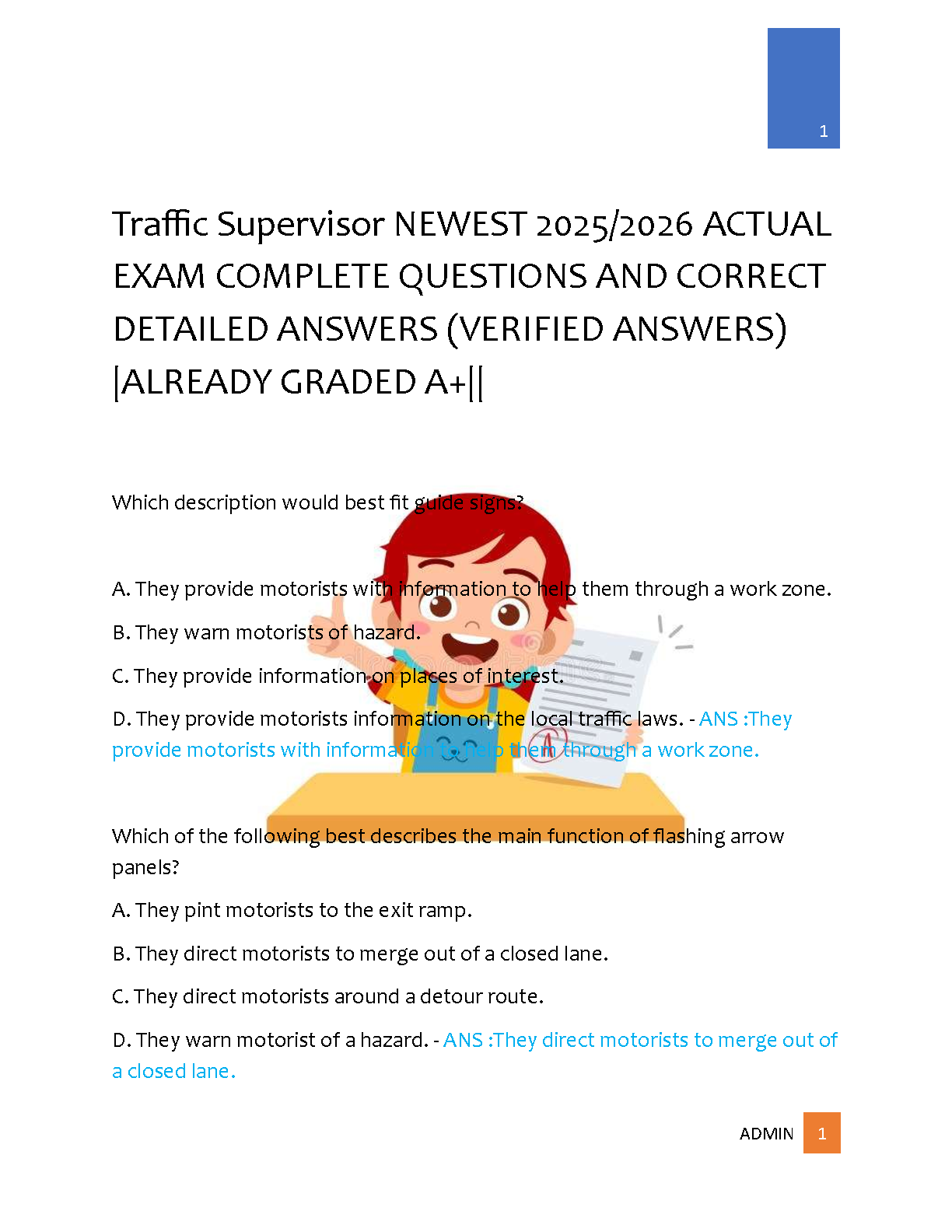 Get ready to ace your Traffic Supervisor certification with our latest 2025/2026 exam test bank! This comprehensive study guide is your ultimate tool for success, featuring a complete set of actual exam questions paired with detailed, verified answers. Each question has been carefully selected to reflect the current exam format and content, ensuring you're studying the most relevant material. Our A+ graded resource is designed to boost your confidence and help you master key concepts, from traffic laws to work zone safety. Download now and pass your Traffic Supervisor exam on the very first attempt, avoiding costly resits!