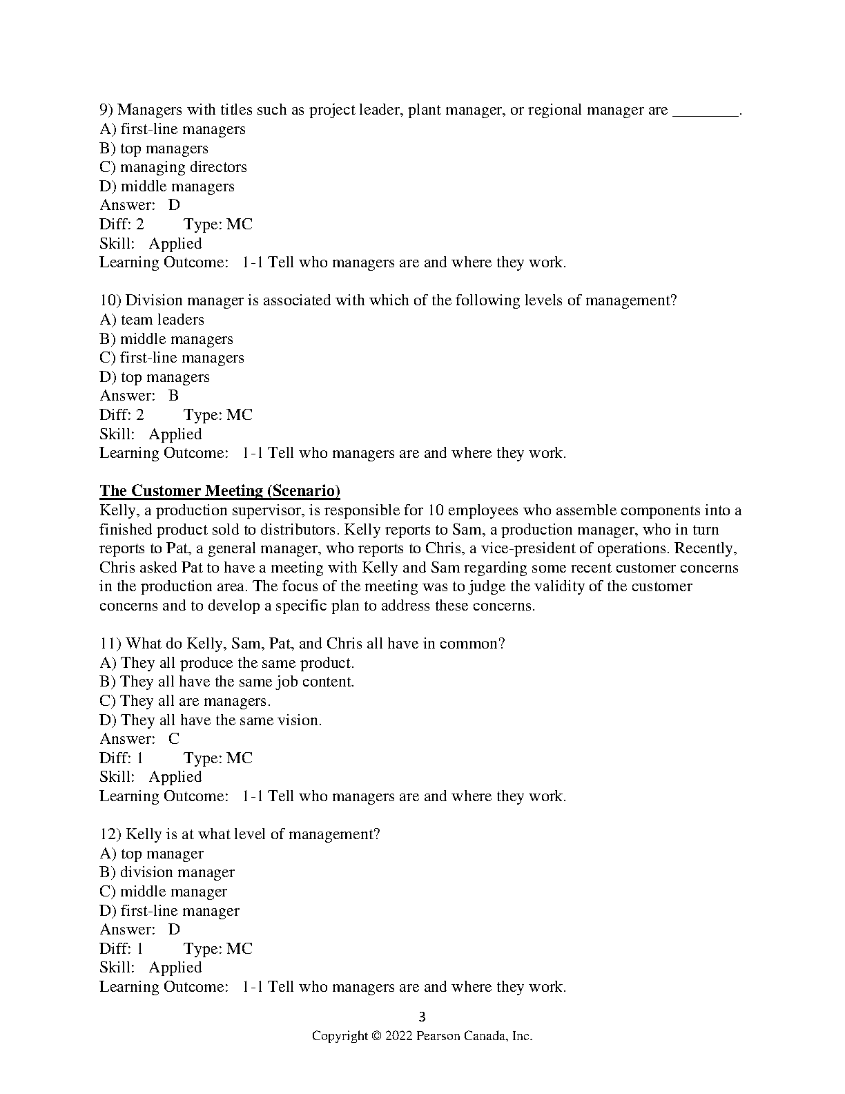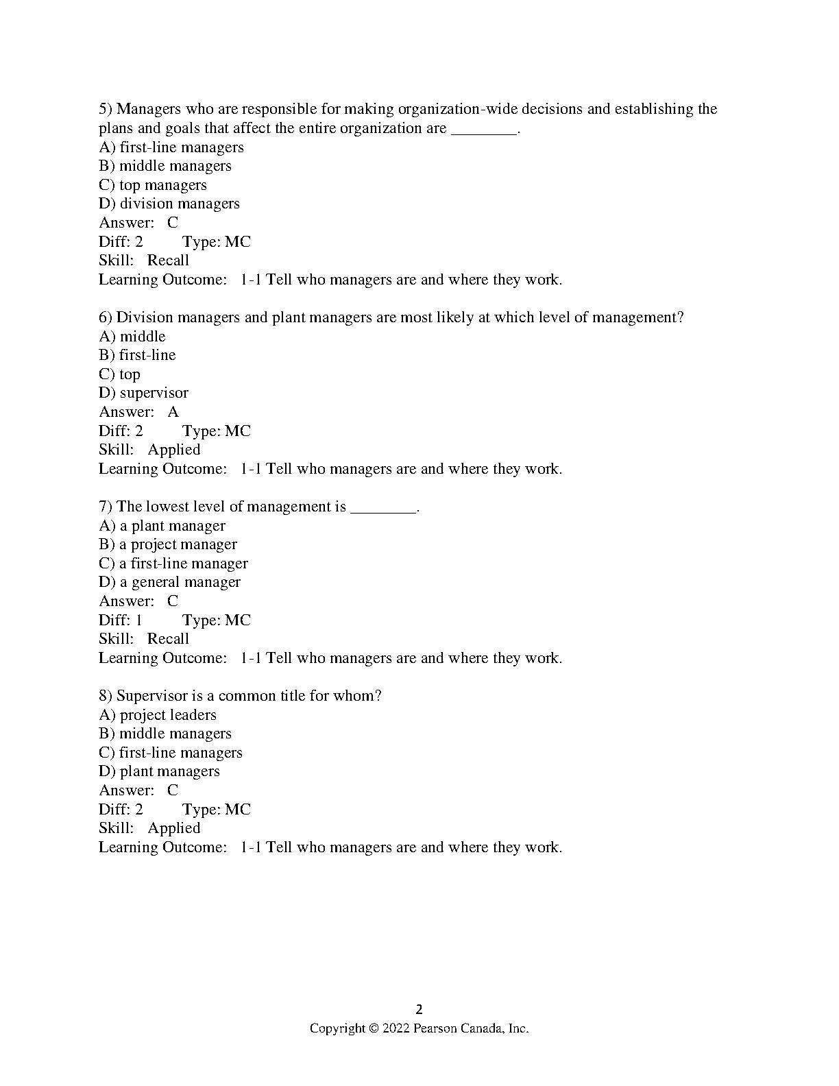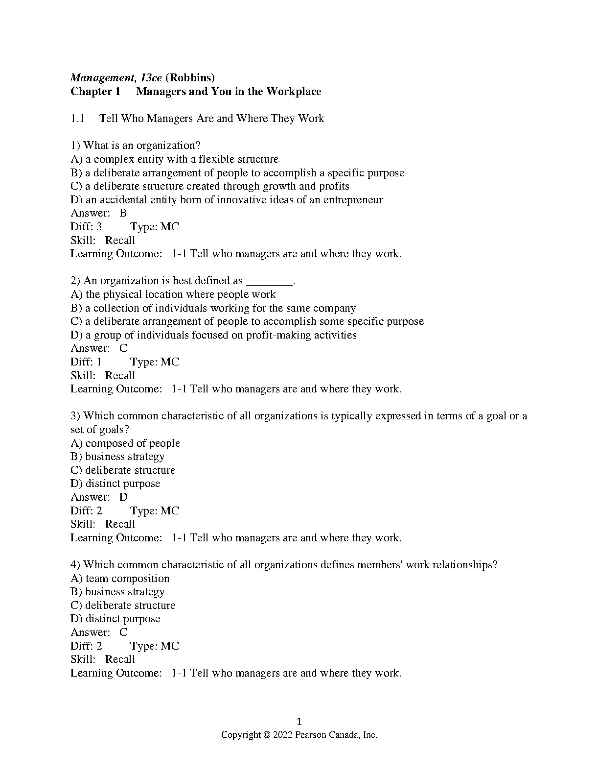 Unlock your full potential and excel in your studies with the complete Test Bank for Management, 13th Canadian Edition by Robbins, Coulter, Langton, and Leach. This essential study aid is packed with a comprehensive collection of exam-style questions, including multiple-choice, true/false, and short answer formats, covering every key concept from all chapters of the textbook. Each question is accompanied by the correct answer, providing you with the perfect tool to practice for exams, reinforce your learning, and master the principles of modern management. Get instant access to this invaluable resource and prepare to ace your course with confidence.