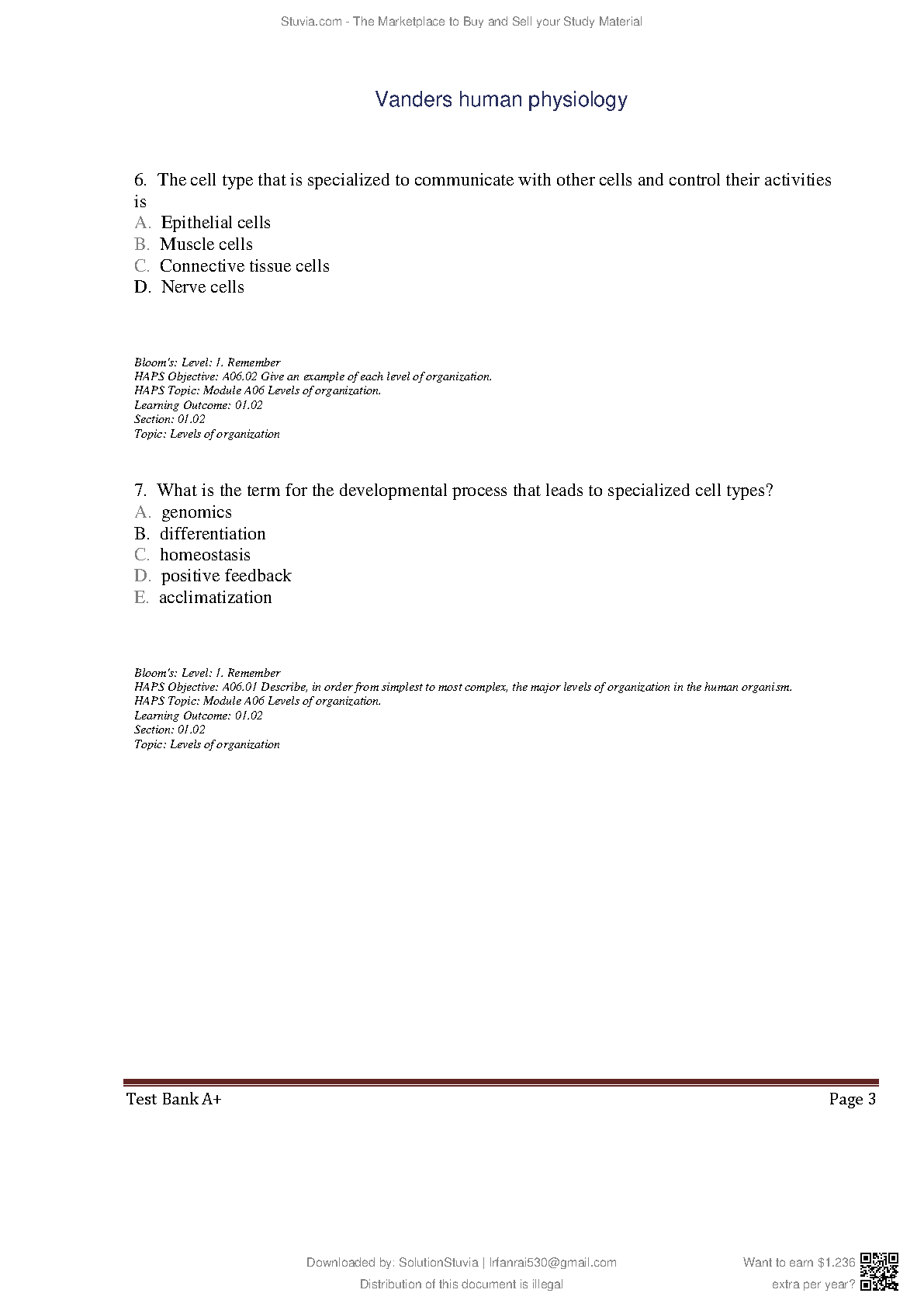 Vander's Human Physiology, 16th Edition by Eric Widmaier, Hershel Raff & Kevin Strang - Complete Test Bank