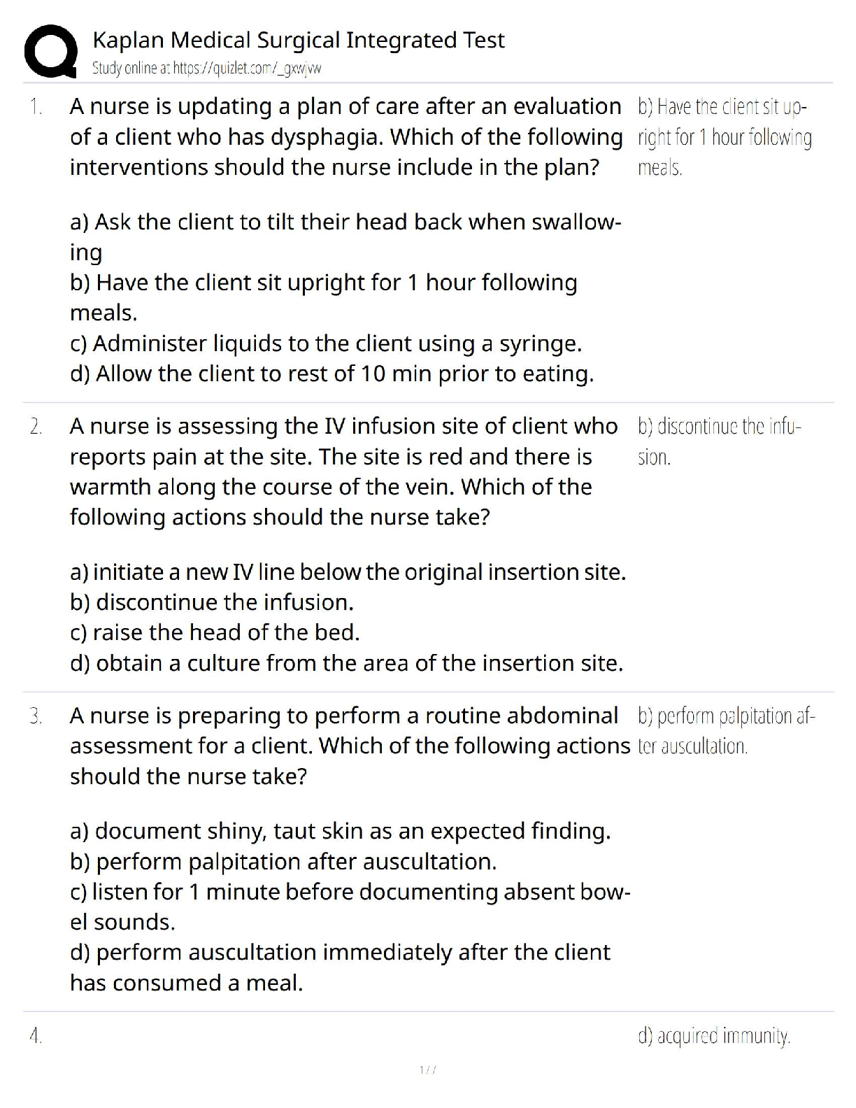 Unlock your full potential with the latest 2025/2026 Kaplan Medical Surgical Integrated Test Bank. This essential study resource is packed with a comprehensive collection of NCLEX-style questions and detailed answers, meticulously designed to cover all critical Med-Surg topics. From dysphagia care plans to IV site management and abdominal assessments, our test bank sharpens your clinical judgment and critical thinking skills. Stop worrying about resits and start preparing to pass your nursing exams on the very first attempt. Ideal for nursing students seeking a reliable and up-to-date tool to master medical-surgical concepts and excel on the NCLEX.