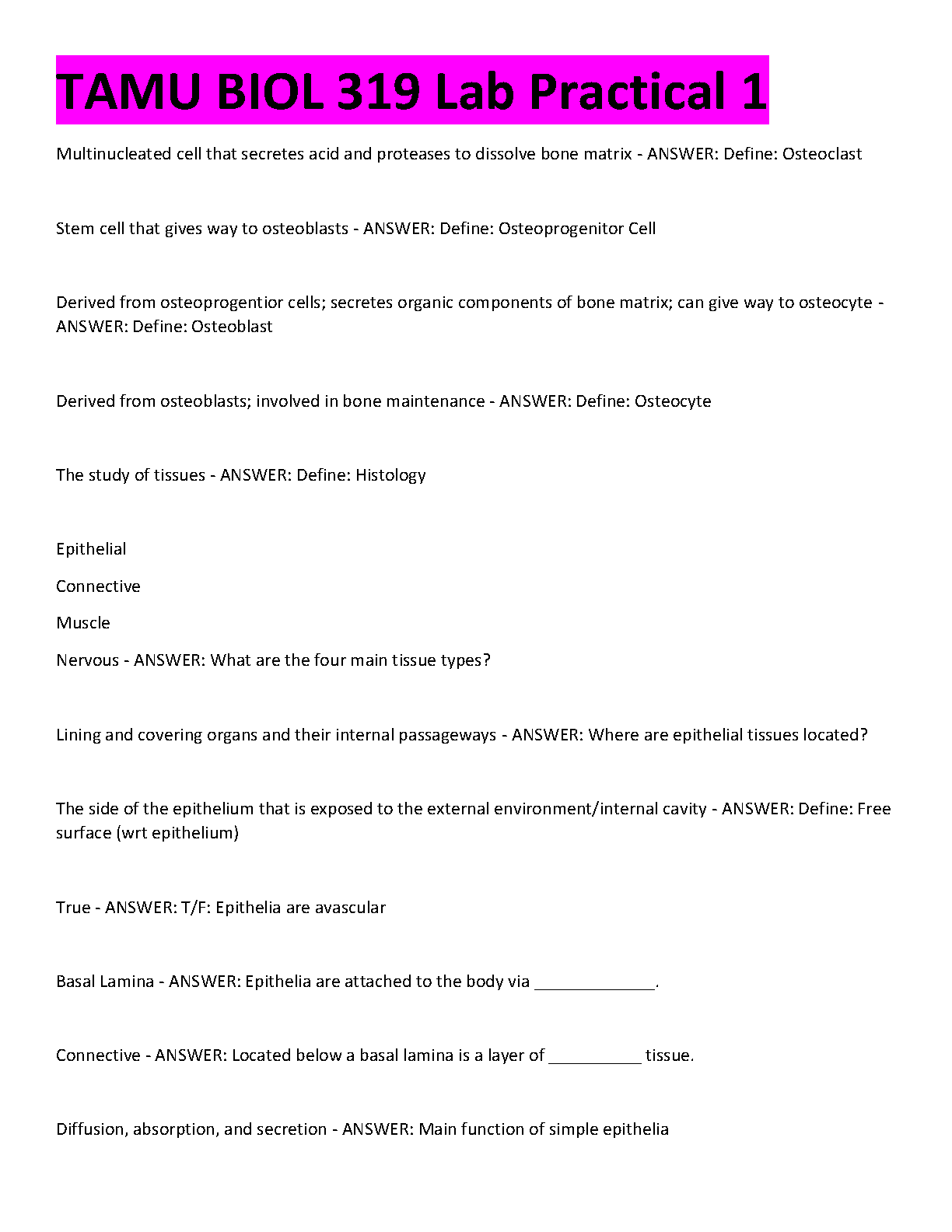 Unlock success in your TAMU BIOL 319 course with this comprehensive study guide for Lab Practical 1. This latest 2025/2026 resource provides a complete set of detailed questions and verified answers, covering all essential topics such as histology, bone cell identification (osteoclasts, osteoblasts, etc.), and the four primary tissue types. Designed to help you master the material efficiently, this guide is your key to acing the exam on the first try and avoiding resits. Download now for a guaranteed path to a top grade!
