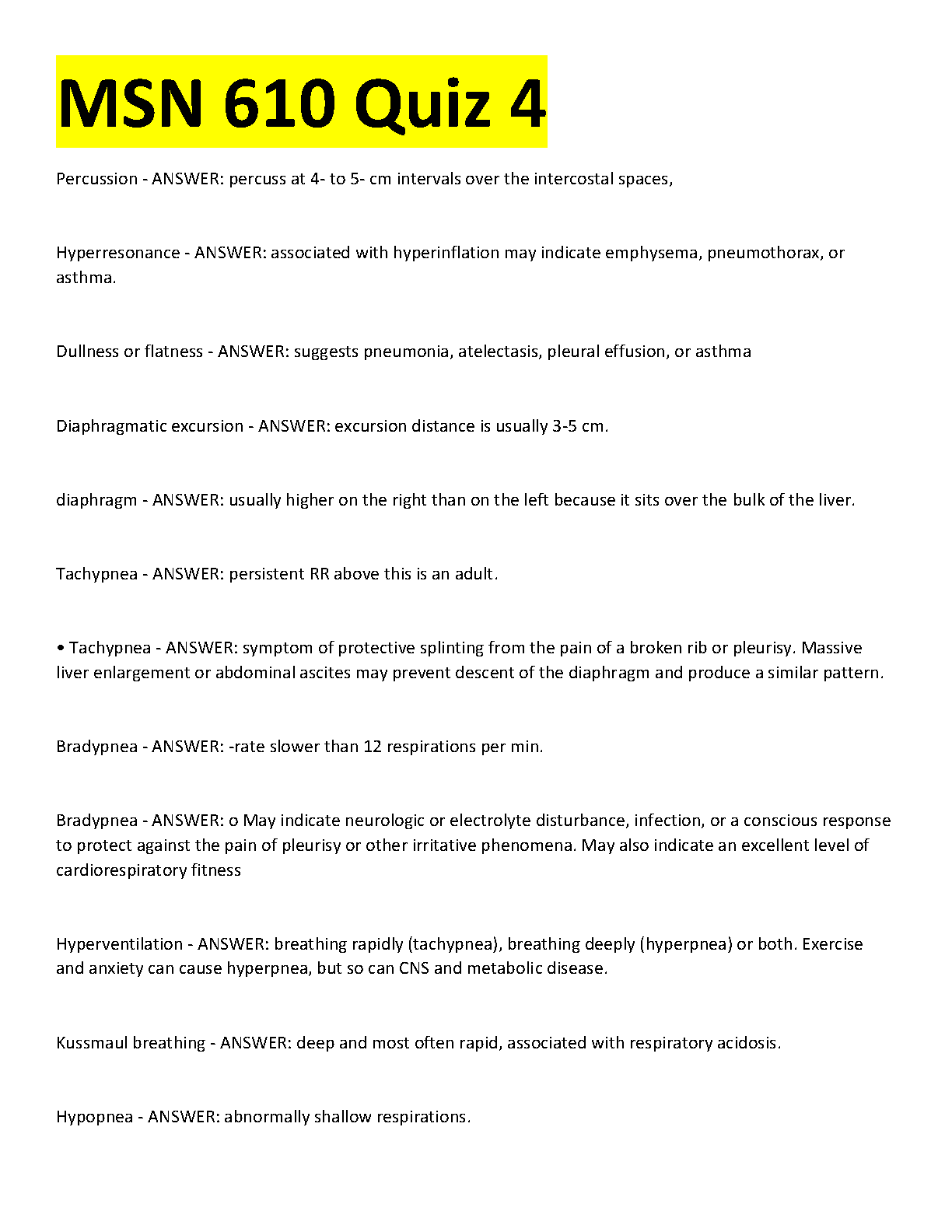 Get instant access to the complete test bank for MSN 610 Quiz 4. This resource provides detailed, 100% correct answers focusing on the crucial topic of respiratory assessment. Master key concepts such as percussion, hyperresonance, tachypnea, Kussmaul breathing, and more. This study guide is expertly designed to help you ace your Quiz 4 and build a strong foundation in advanced health assessment. Download now to study effectively and pass your exams with confidence.
