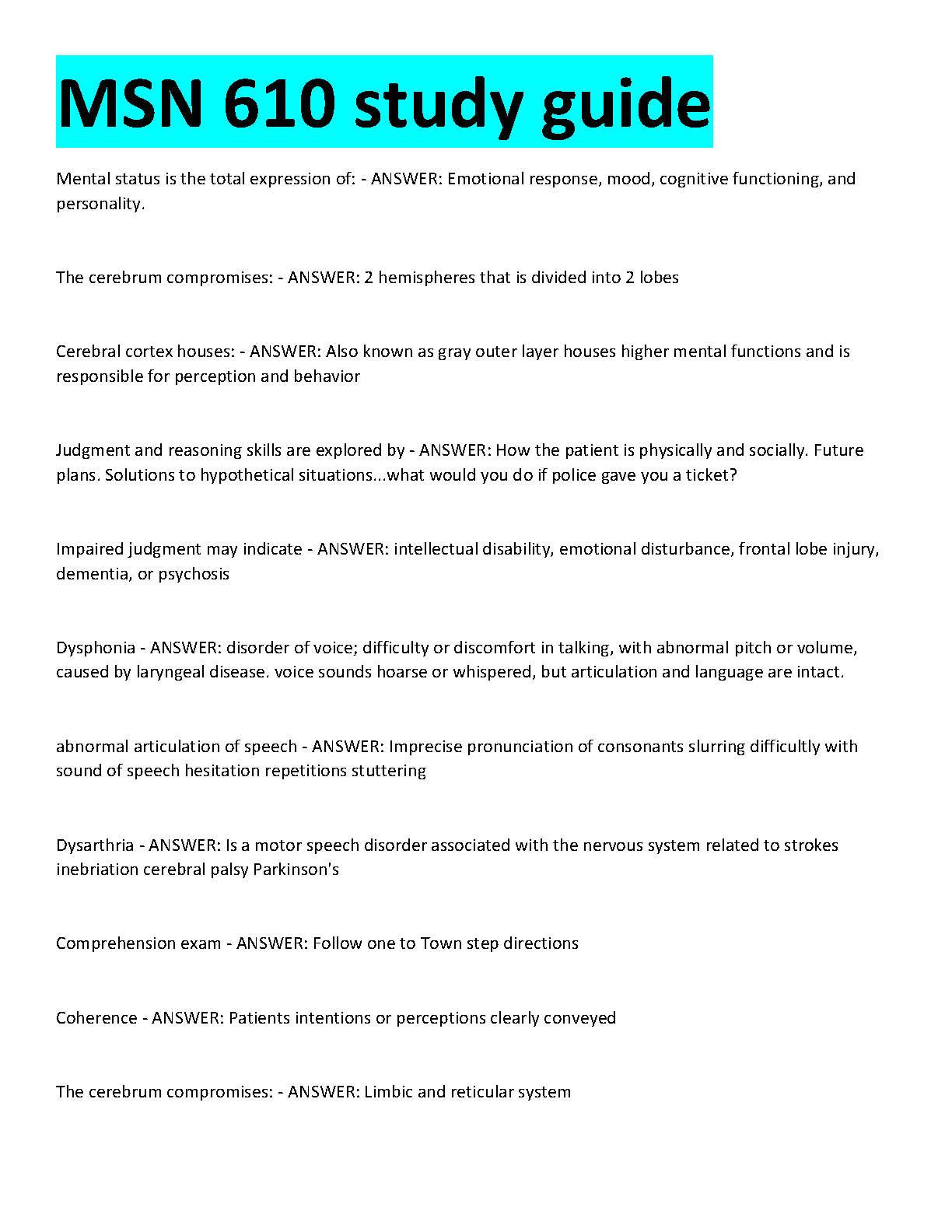 Excel in your Advanced Health Assessment course with this ultimate MSN 610 study guide, fully updated for the 2025/2026 academic year. This resource breaks down complex topics into an easy-to-understand Q&A format, focusing on the critical neurological and mental status examination. Master key concepts such as cognitive function, cerebrum anatomy, judgment assessment, and the distinctions between speech disorders like dysphonia and dysarthria. This guide is expertly crafted to provide the clarity and confidence you need to pass your exams on the first attempt and avoid costly resits. Get the edge you need to succeed in your nursing program!