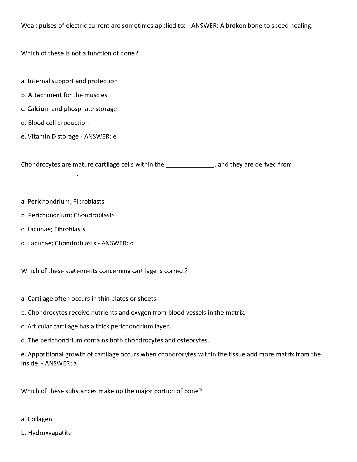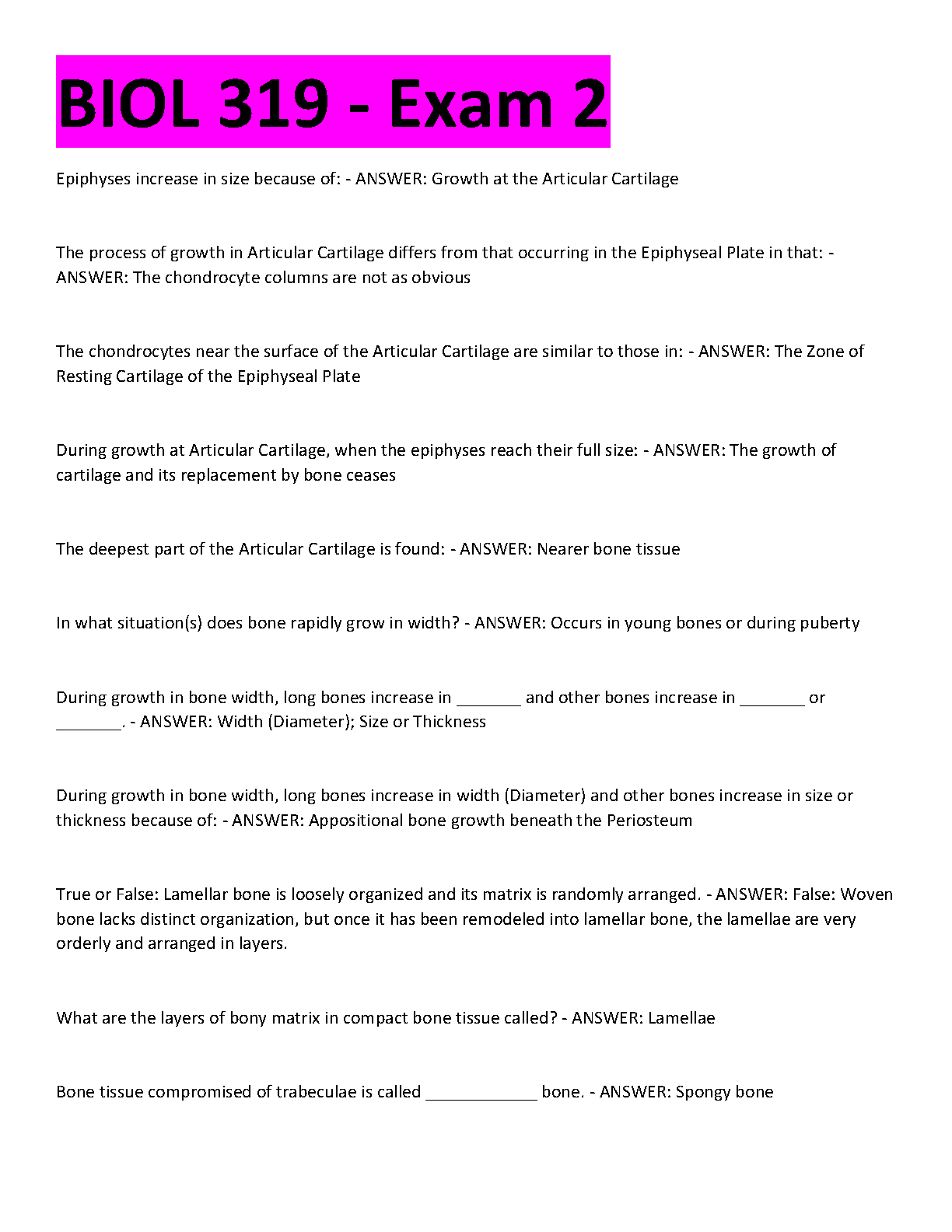 Unlock your full potential in BIOL 319 with our meticulously prepared Test Bank for Exam 2. This essential study tool features a comprehensive set of questions paired with detailed, accurate answers, focusing directly on the skeletal system. Dive deep into crucial topics including bone development, the mechanics of articular cartilage, the role of the epiphyseal plate, appositional bone growth, and the distinct structures of lamellar and spongy bone. Equip yourself with this guide to confidently tackle your exam, solidify your knowledge, and secure the excellent grade you deserve.