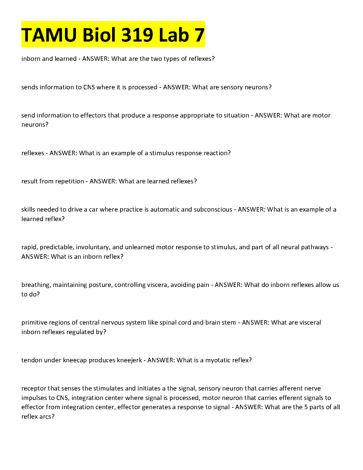 Get the latest 2025/2026 study guide for TAMU BIOL 319 Integrative Animal Physiology, Lab 7. This comprehensive resource covers all essential topics on reflexes, including the differences between inborn and learned reflexes, the roles of sensory and motor neurons, and the complete 5-part reflex arc. Presented in an easy-to-follow question-and-answer format, this guide is expertly designed to help you understand complex concepts and ace your exams on the first try. Stop worrying about resits and secure your A+ with these targeted study notes.