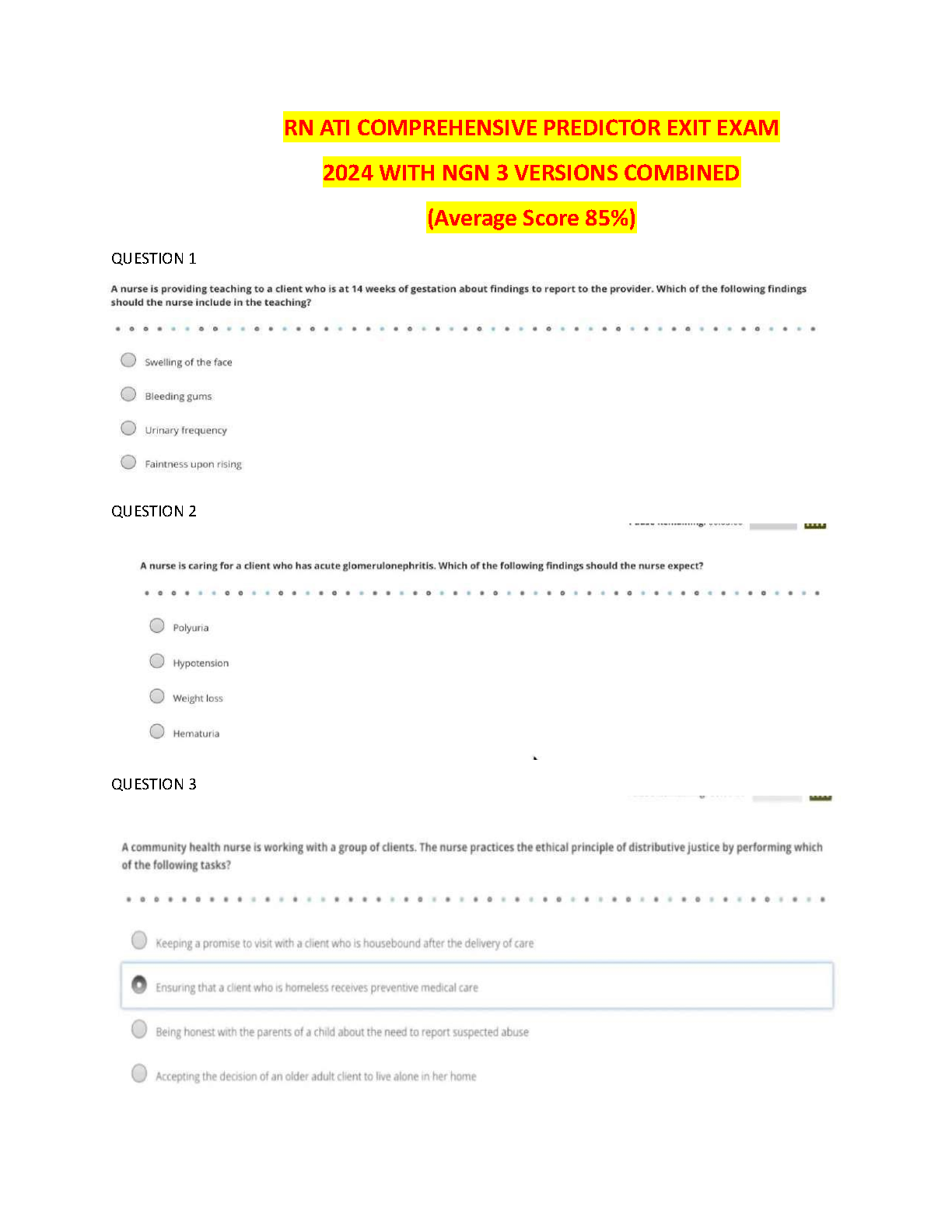 Ace your nursing school finals and step confidently into your career with the ultimate study resource! This is the complete 2024 Test Bank for the RN ATI Comprehensive Predictor Exit Exam, featuring three combined NGN-style versions. Designed to help you master critical nursing concepts and familiarize yourself with the Next Generation NCLEX (NGN) format, this guide is your key to passing on the first attempt. Our materials are proven effective, with users achieving an average score of 85%. This comprehensive package includes a wide range of questions covering all essential nursing topics, preparing you for any challenge on the real exam. Stop stressing about resits—download now and secure your path to becoming a registered nurse!