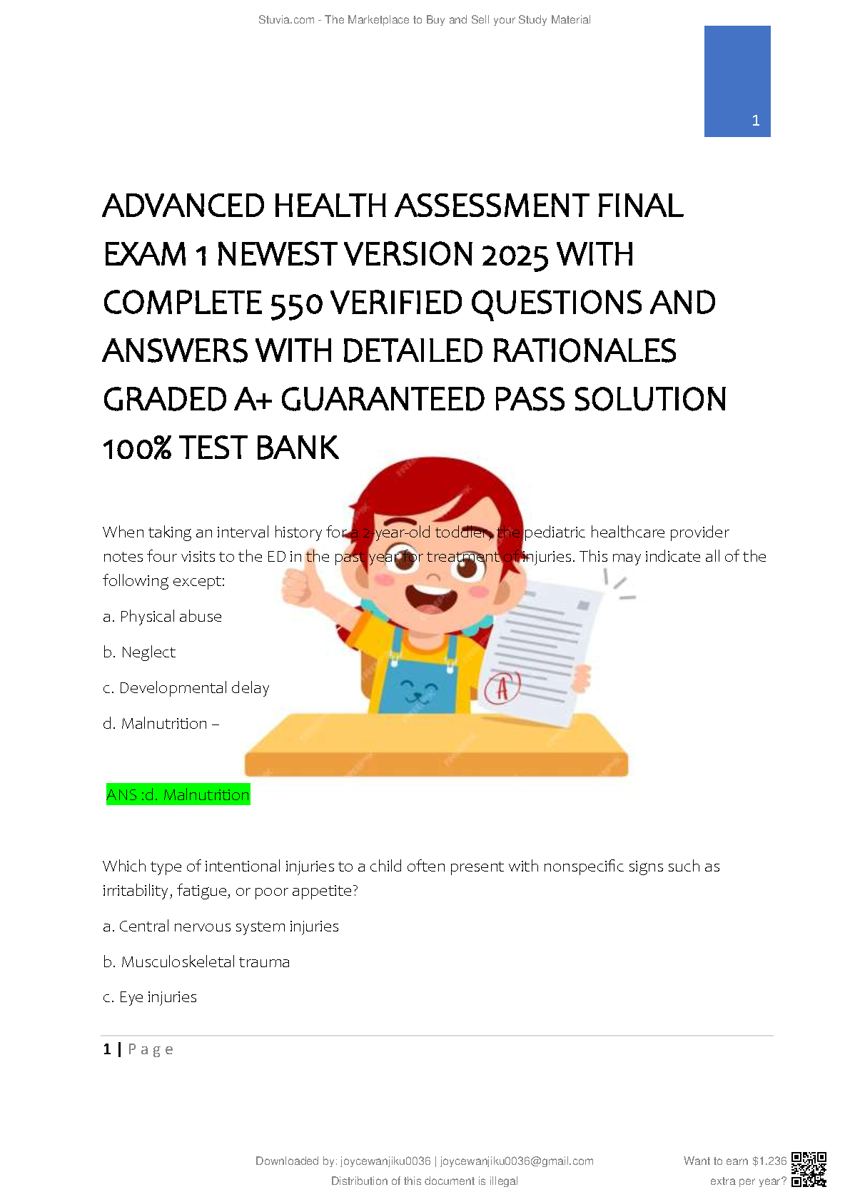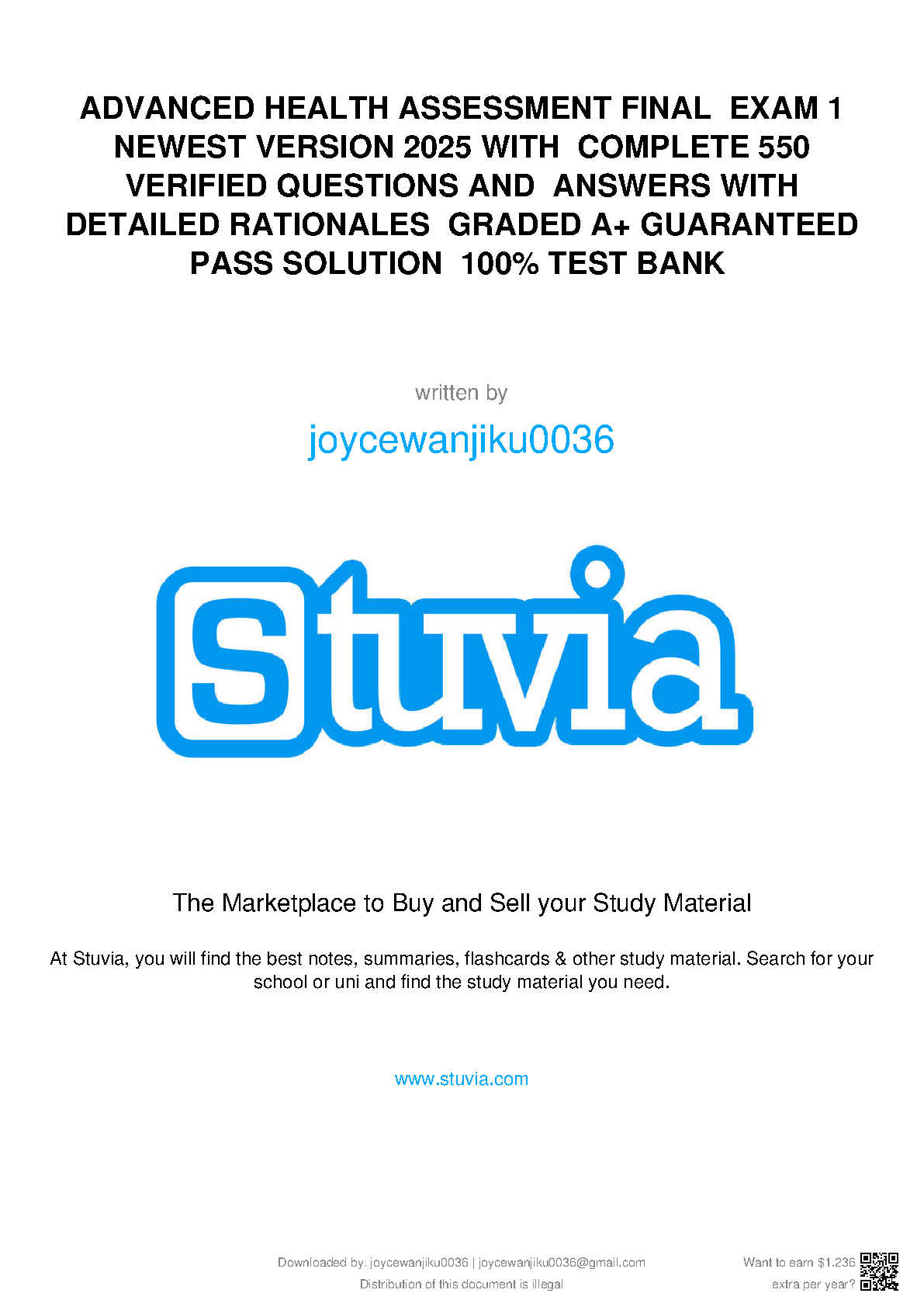 Excel in your Advanced Health Assessment course with this comprehensive and updated 2025 Test Bank for Final Exam 1. This essential study guide features a complete collection of 550 verified questions, each paired with detailed answers and in-depth rationales. It's expertly crafted to ensure you grasp key concepts, achieve an A+ grade, and pass your exam with confidence. Prepare effectively and master the material with this guaranteed pass solution.