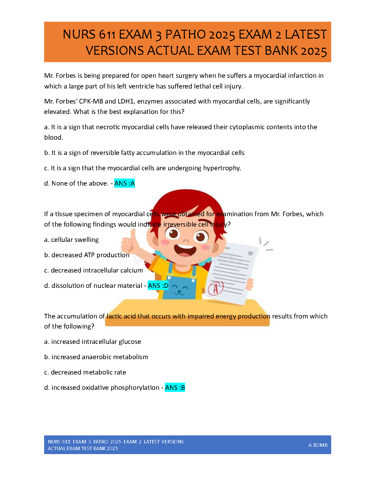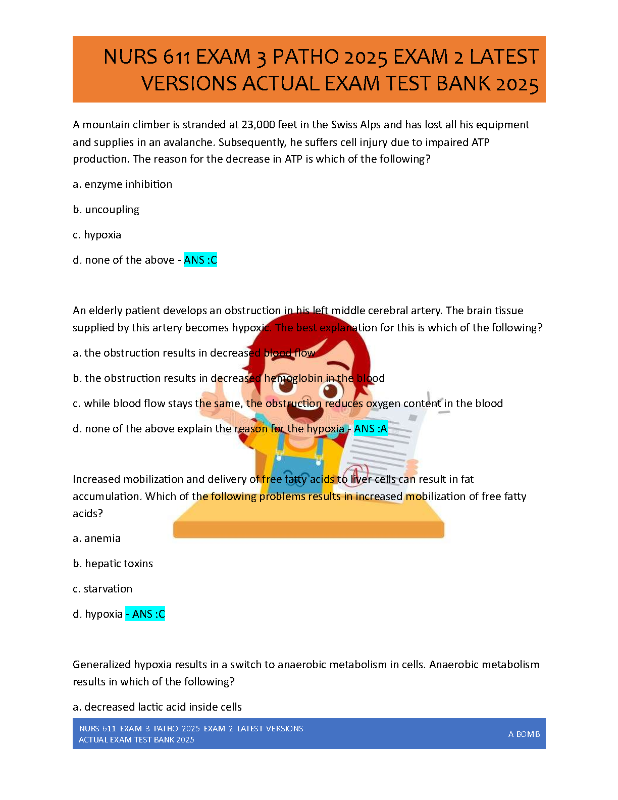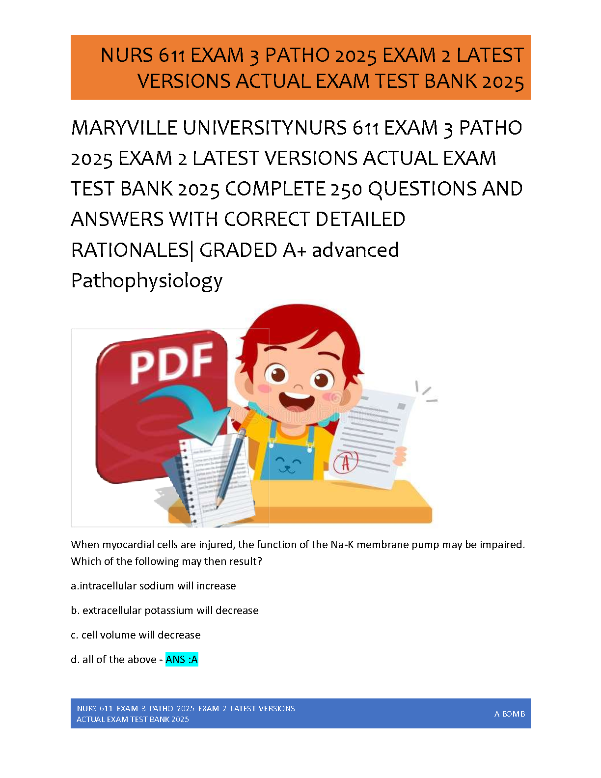 Ace your Advanced Pathophysiology exams at Maryville University with the ultimate study resource for NURS 611. This 2025 test bank, covering Exam 2 and Exam 3, provides a complete set of over 250 meticulously crafted questions and answers. Each question comes with a correct, detailed rationale to deepen your understanding of complex pathophysiological concepts. This guide is your key to mastering the material, achieving A+ results, and passing your exams with confidence. Unlock success in NURS 611 today!