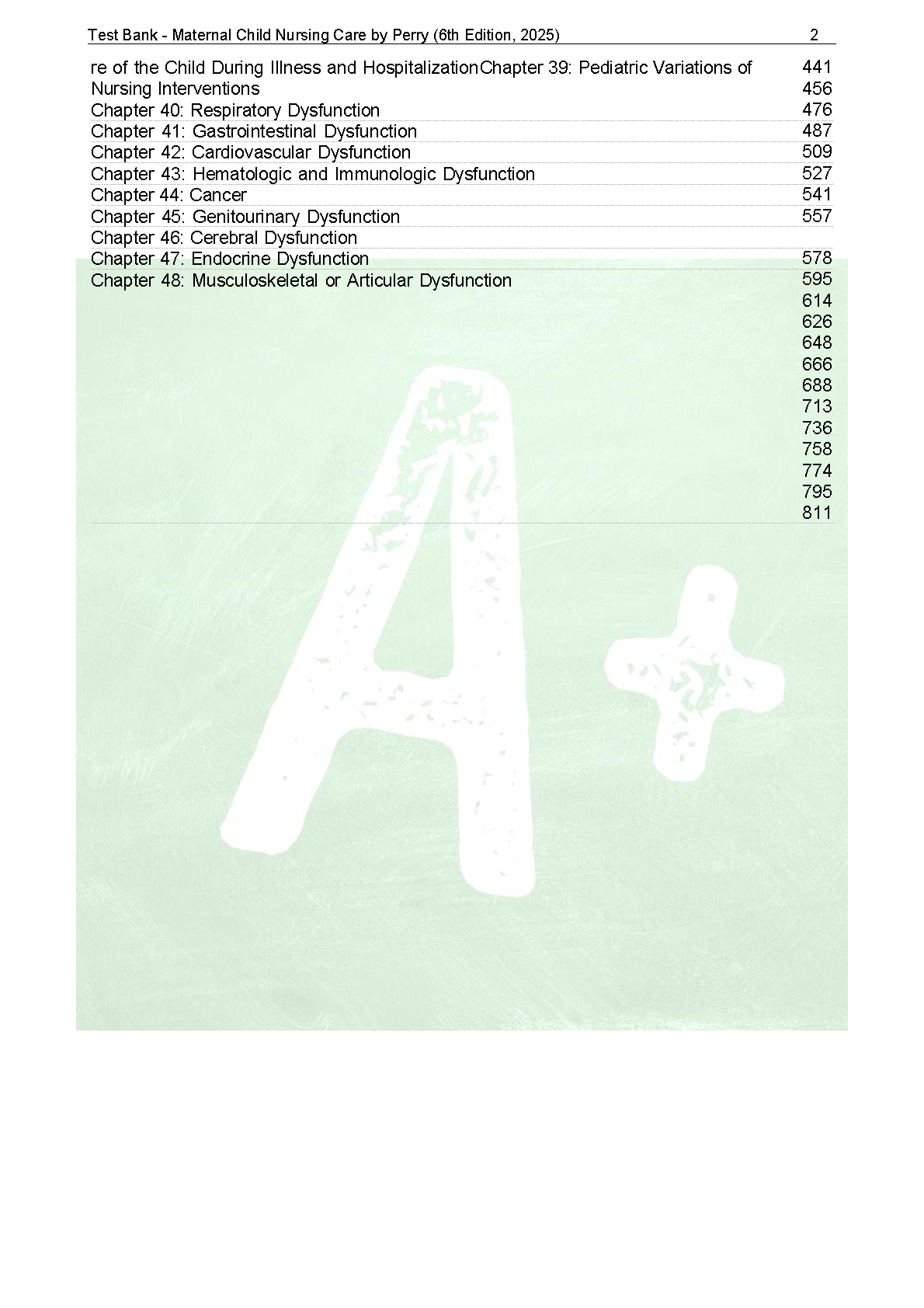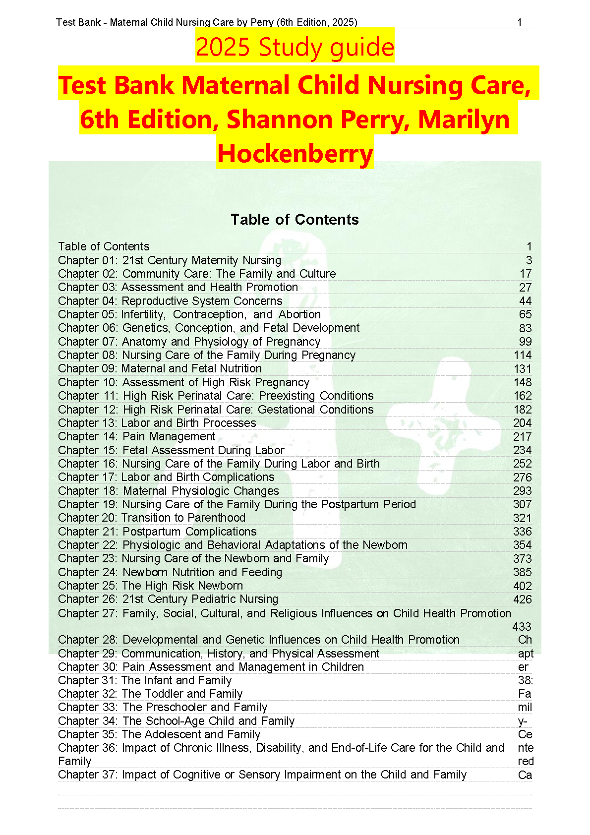 Ace your Maternal and Child Nursing courses with the official Test Bank for the 6th Edition of 'Maternal Child Nursing Care' by Shannon E. Perry, Marilyn J. Hockenberry, Deitra Leonard Lowdermilk, and David Wilson. This comprehensive 2025/2026 study guide is your ultimate resource for mastering complex concepts and preparing for exams with confidence. It features a vast collection of exam-style questions with detailed, verified answers covering all 37 chapters—from pregnancy and childbirth to newborn and pediatric care. Designed to help you understand key topics, improve your critical thinking skills, and pass your exams on the first try, this test bank is an essential tool for every nursing student aiming to excel and avoid resits.