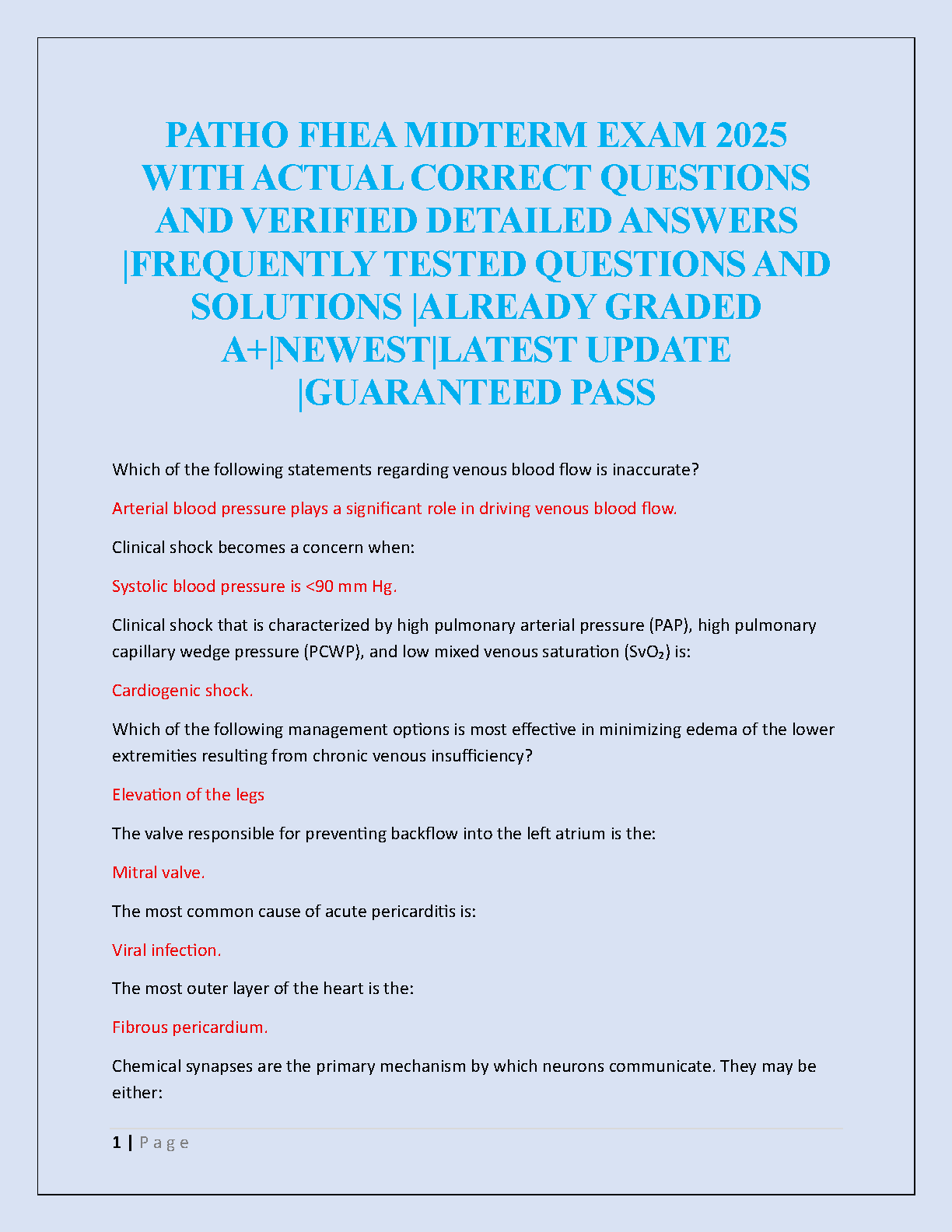 Unlock exam success with our latest 2025 Test Bank for the Patho FHEA Midterm Exam. This comprehensive resource is packed with a wide range of frequently tested questions and meticulously verified, detailed answers. Our A+ graded solutions are designed to give you a clear understanding of key pathophysiology concepts and boost your confidence. Stop worrying about resits—this study guide is your ultimate tool to master the material, prepare effectively, and pass your exam with top marks on the first try. Get the edge you need to excel in your Patho FHEA course!