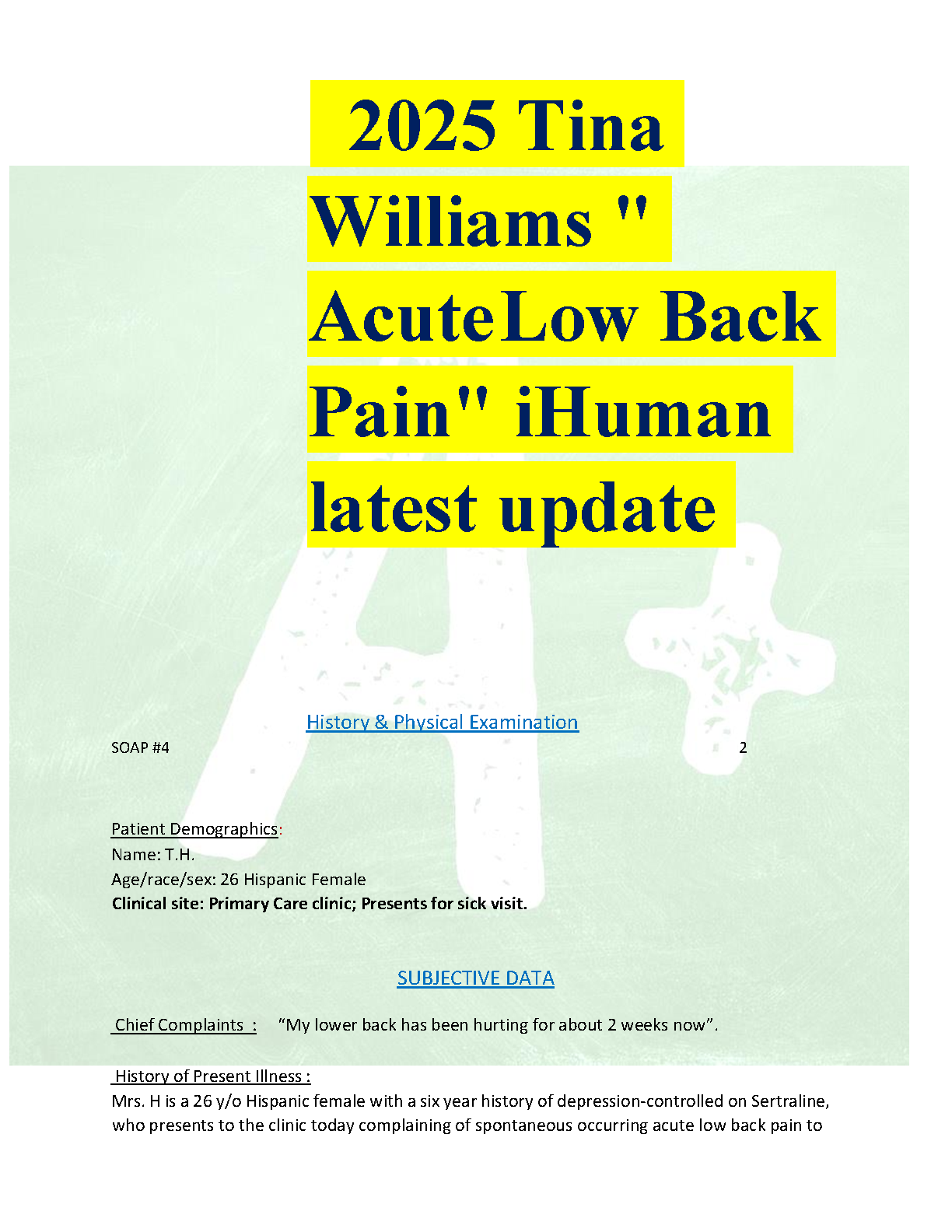 Master the Tina Williams 'Acute Low Back Pain' iHuman case study with our comprehensive 2025/2026 guide. This resource provides a detailed analysis, including correct answers for the history, physical exam, diagnosis, and treatment plan for T.H., a 26-year-old female patient. Perfect for nursing and medical students aiming to achieve top scores on their virtual patient simulations and clinical assessments. Avoid resits and pass your exams on the first attempt with this expertly crafted study aid.
