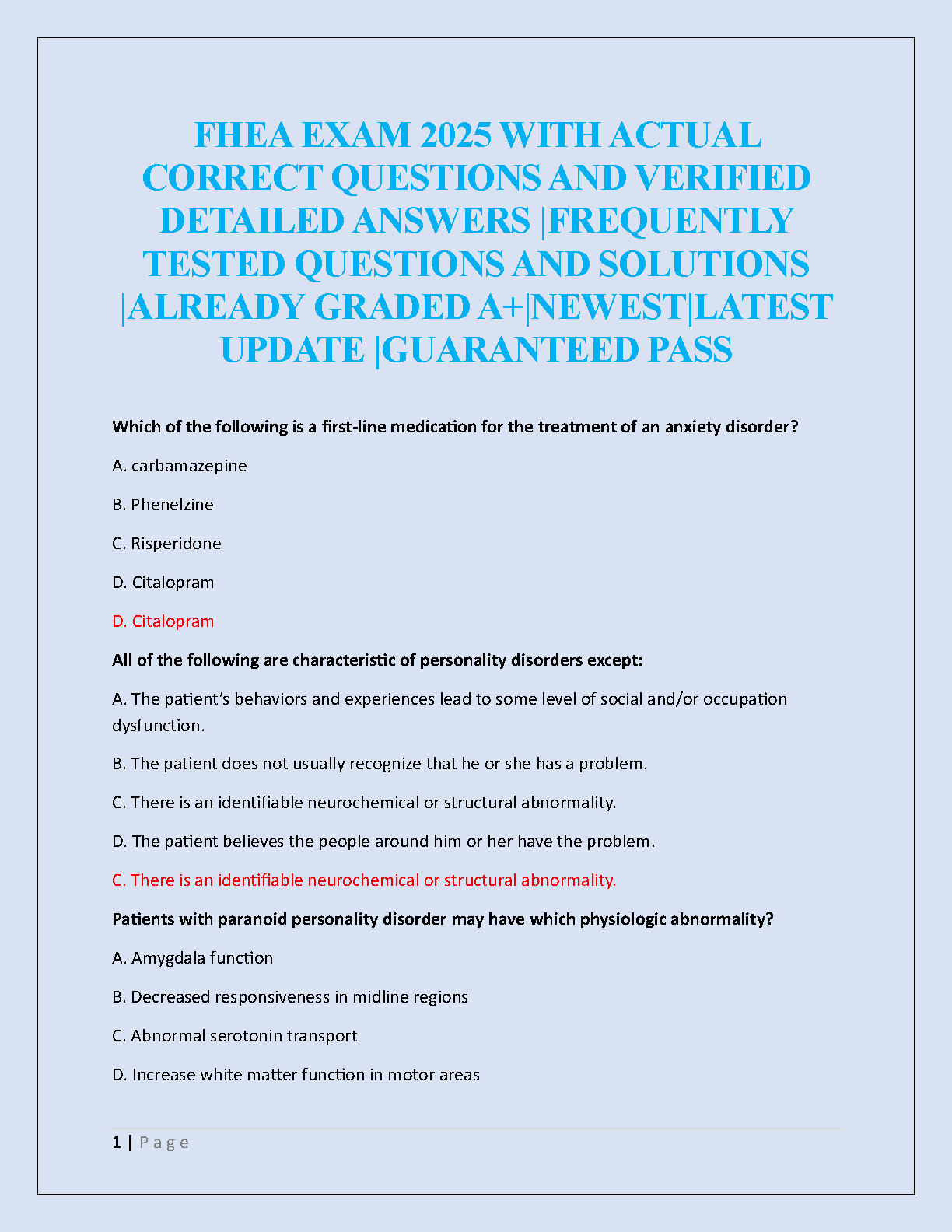 Ace your upcoming FHEA exam with our newly updated 2025 Test Bank! This comprehensive study guide is meticulously designed to help you pass on your very first attempt. Inside, you'll find a wealth of actual, frequently tested exam questions complete with verified, detailed answers and solutions. Our resource covers critical topics such as psychopharmacology, personality disorders, and other key concepts, ensuring you are fully prepared for what's to come. This A+ graded guide is your ultimate tool for success, building the confidence you need to excel and avoid costly resits. Get your guaranteed pass today!