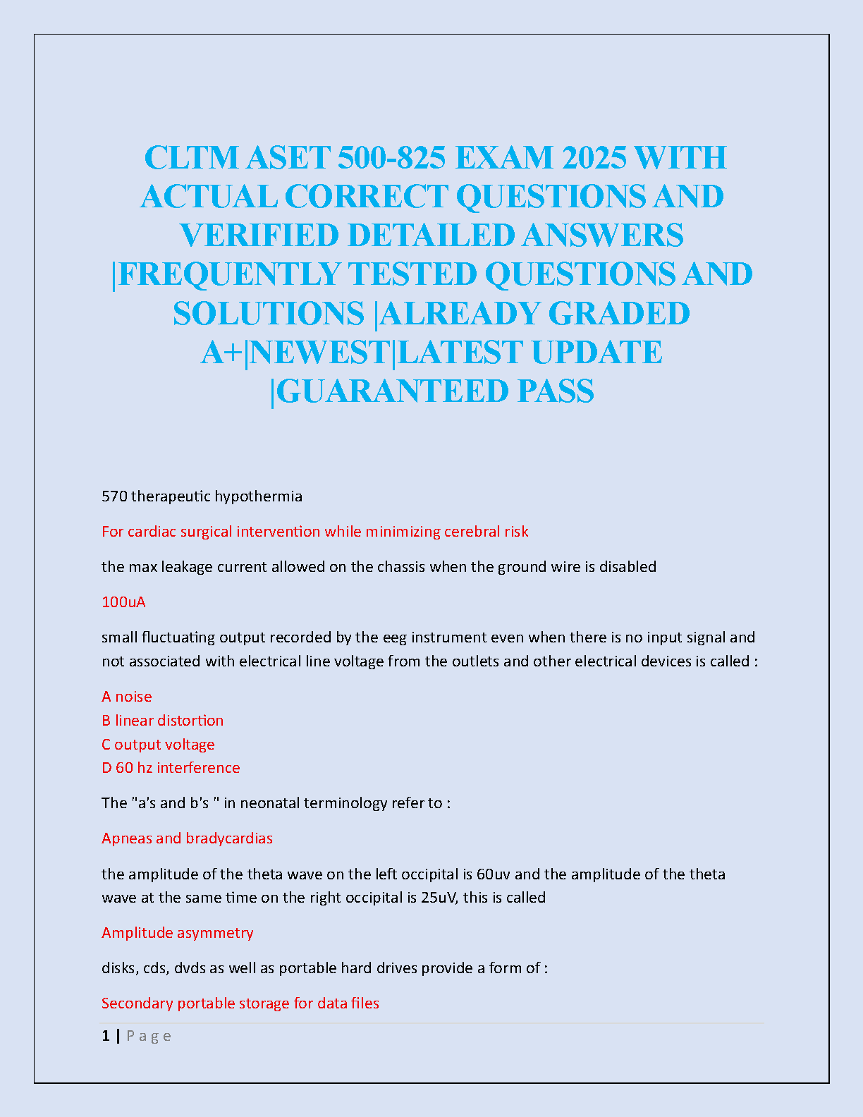 Prepare to excel in your ASET Certification in Long Term Monitoring (CLTM) exam with our newly updated 2025 Test Bank. This comprehensive resource is packed with actual exam questions and meticulously verified, detailed answers. Covering all essential topics in neurodiagnostics, this guide is designed to help you master the material, boost your confidence, and achieve an A+ grade on your first attempt. Secure your certification and advance your career with this guaranteed-pass study solution.