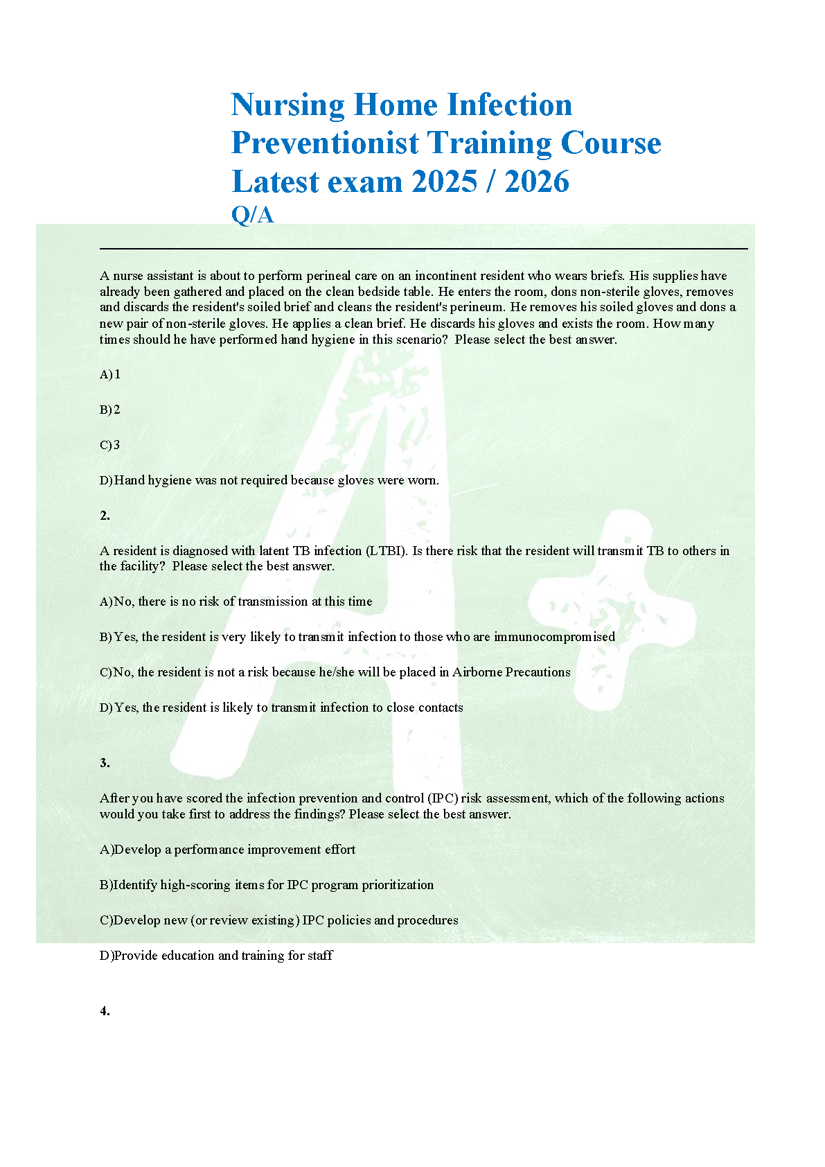 Ace your certification with our latest 2025/2026 Test Bank for the Nursing Home Infection Preventionist Training Course. This comprehensive study guide is specifically designed to help you pass your exam on the first attempt, eliminating the need for costly resits. Inside, you'll find a meticulously curated collection of questions and answers (Q&A) covering all essential topics, including proper hand hygiene protocols, transmission risks for infections like latent TB, and strategies for infection prevention and control (IPC) risk assessment. Each question is crafted to mirror the format and difficulty of the actual exam, ensuring you are fully prepared and confident. Stop worrying and start studying smart with this essential resource for mastering infection control in a nursing home environment.