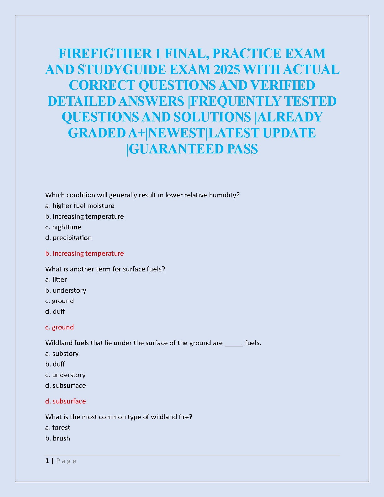 Ace your Firefighter 1 final exam with this comprehensive test bank and study guide for 2025. This resource is meticulously crafted based on the 'Essentials of Fire Fighting, 7th Edition' by IFSTA. Inside, you will find a complete collection of frequently tested questions, each with a verified, detailed answer to ensure you fully understand the concepts. This study guide is already graded A+ and is designed to provide you with the latest, most accurate material to guarantee a pass on your first attempt. Stop worrying about resits and start studying smart with our top-rated Firefighter 1 practice exam solution.