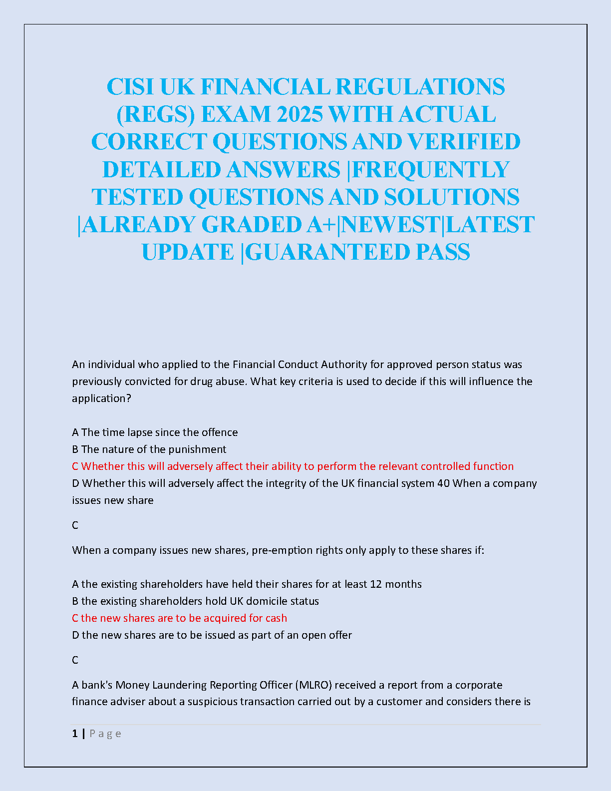 CISI UK Financial Regulation (Regs) 2025 Test Bank | Latest Exam Questions & Verified Answers for a Guaranteed Pass