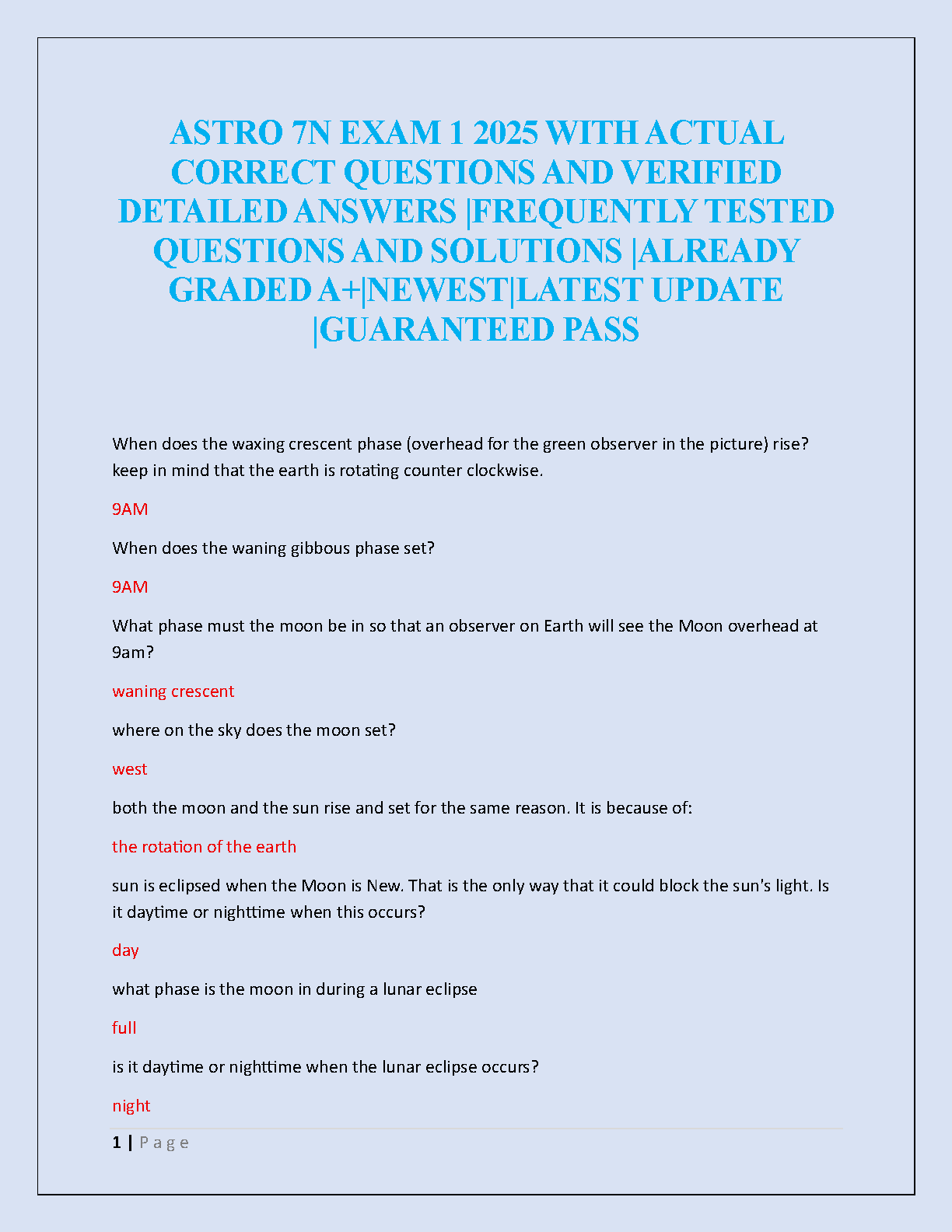 Ace your ASTRO 7N Exam 1 with this ultimate study resource for the 2025-2026 academic year. This comprehensive test bank features a collection of actual exam questions, each paired with a verified, detailed answer to ensure you grasp the core concepts. Covering key topics such as lunar phases, celestial motion, and eclipses, this guide is expertly curated to reflect frequently tested material. Stop cramming and start studying smarter. This A+ graded material is your key to mastering the subject, boosting your confidence, and passing your exam on the very first try. Get the edge you need for guaranteed success in your astronomy course.