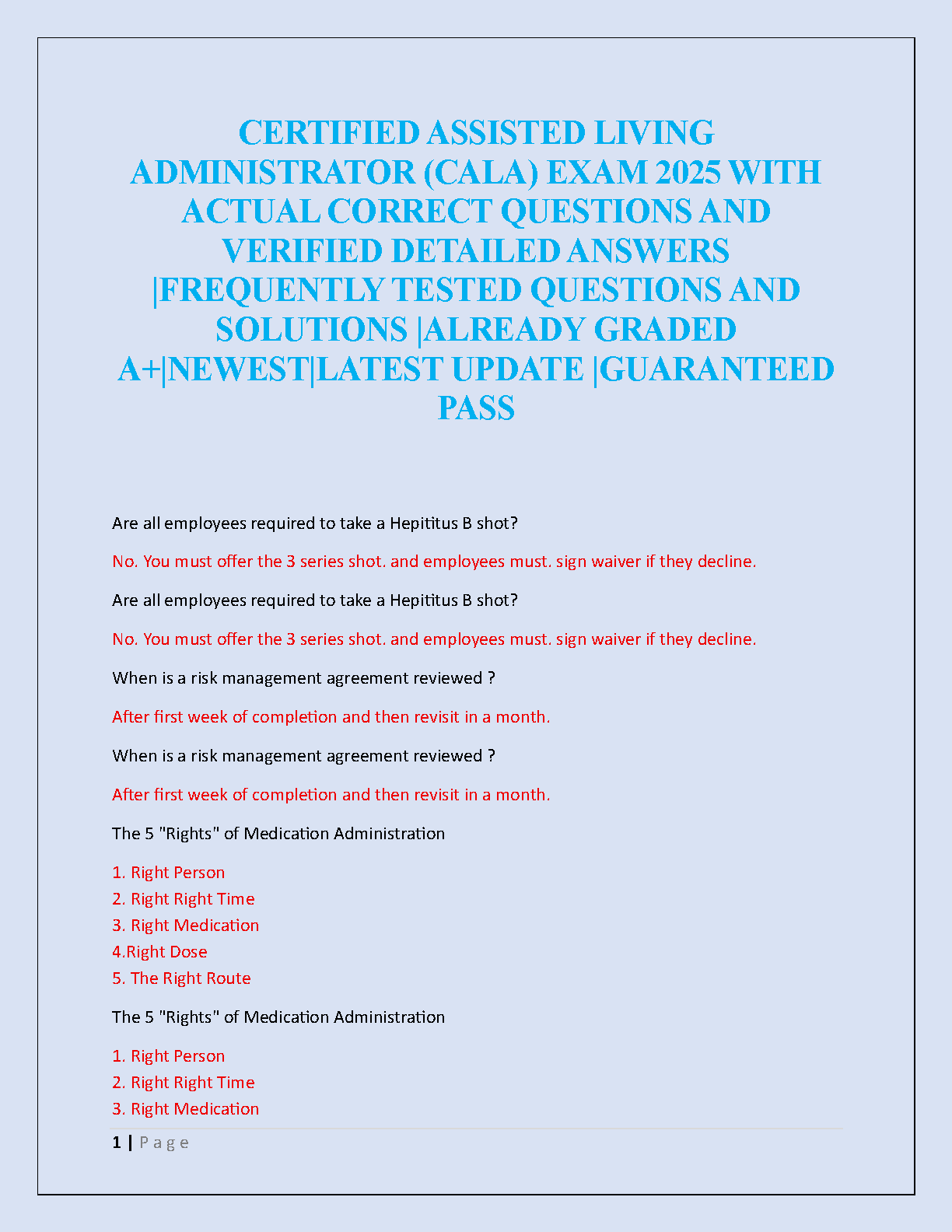 Ace your Certified Assisted Living Administrator (CALA) exam on the first attempt with this comprehensive 2025 test bank. This guide is packed with actual, frequently tested questions and verified, detailed answers to ensure you are fully prepared. Covering crucial topics like the '5 Rights' of Medication Administration, risk management protocols, and employee health standards, this A+ graded resource is your key to success. Study smart, build confidence, and earn your CALA certification without the stress of a resit.