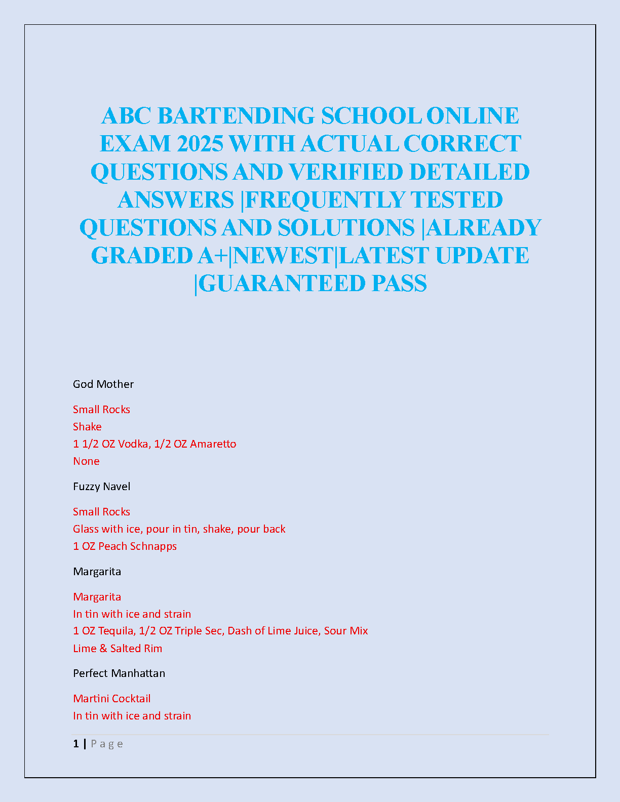 Prepare to ace your bartending certification with our comprehensive test bank for the ABC Bartending School Online Exam 2025. This ultimate study guide is packed with actual, frequently tested exam questions and meticulously verified, detailed answers. Designed to help you pass on your very first try, this resource covers all essential topics, including classic cocktail recipes and bartending techniques. Say goodbye to exam stress and resits! Our A+ graded material is the latest update, ensuring you have the most current information to secure your certification with confidence.