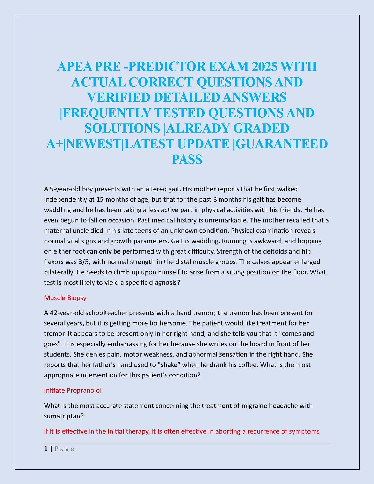 Ace your APEA Predictor Exam on the first try with our newly updated 2025/2026 study guide. This comprehensive resource is packed with a wide range of actual, frequently tested questions, each accompanied by a verified, detailed answer and rationale. Designed to mirror the real exam format, our guide helps you master key concepts, build confidence, and identify areas for improvement. Stop worrying about resits and start preparing effectively. Get the A+ grade you deserve and guarantee your pass with this essential tool for all NP students.